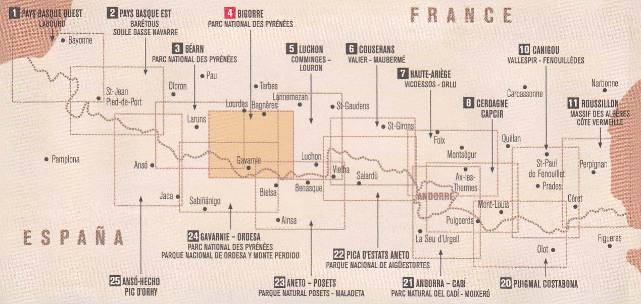Francouzské a španělské Pyreneje na podrobných turistických mapách v měřítku 1:50.000 z edice Rando na topografickém podkladu od Institut Géographique National a Institut Cartografic de Catalunya. Zvýraznění turistických tras, včetně GR10 a GR11, horské chaty, různá zařízení pro volný čas a sportovní centra atd. Mapy č. 1 až 11 zobrazují hlavně francouzskou část, s vrstevnicemi v 20ti metrových intervalech. Mapy s čísly 20 a výše zobrazují španělskou stranu.