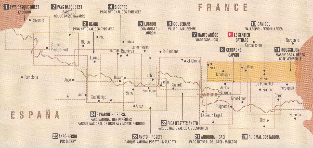 Francouzské a španělské Pyreneje na podrobných turistických mapách v měřítku 1:50.000 z edice Rando na topografickém podkladu od Institut Géographique National a Institut Cartografic de Catalunya. Zvýraznění turistických tras, včetně GR10 a GR11, horské chaty, různá zařízení pro volný čas a sportovní centra atd. Mapy č. 1 až 11 zobrazují hlavně francouzskou část, s vrstevnicemi v 20ti metrových intervalech. Mapy s čísly 20 a výše zobrazují španělskou stranu.