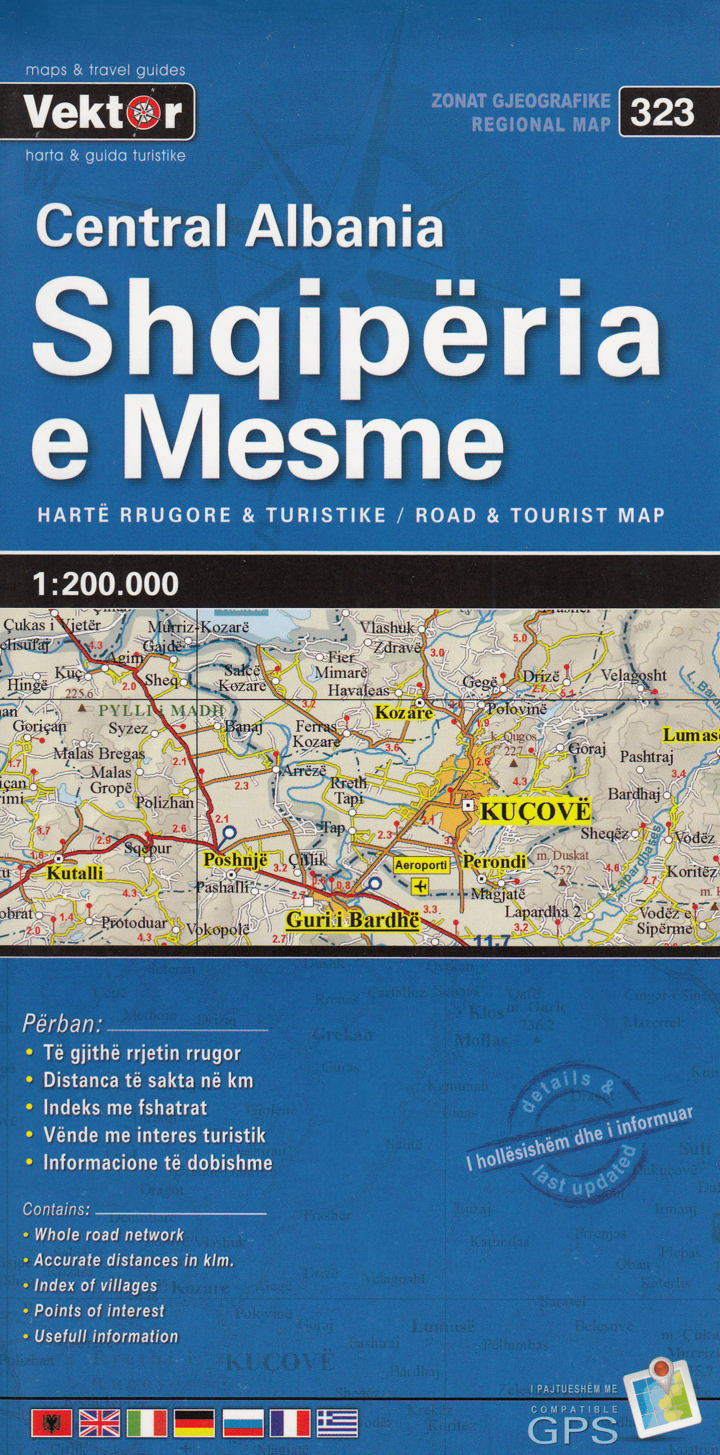 Picturesque towns and villages are highlighted. Map symbols indicate camp sites, ski areas, churches, monasteries, castles, archaelogical remains, etc. Latitude and longitude lines are drawn at 10' intervals. The place name index is placed next to the map cover. Multilingual map legend includes English. Authentic, road-tested Albanian cartography.
