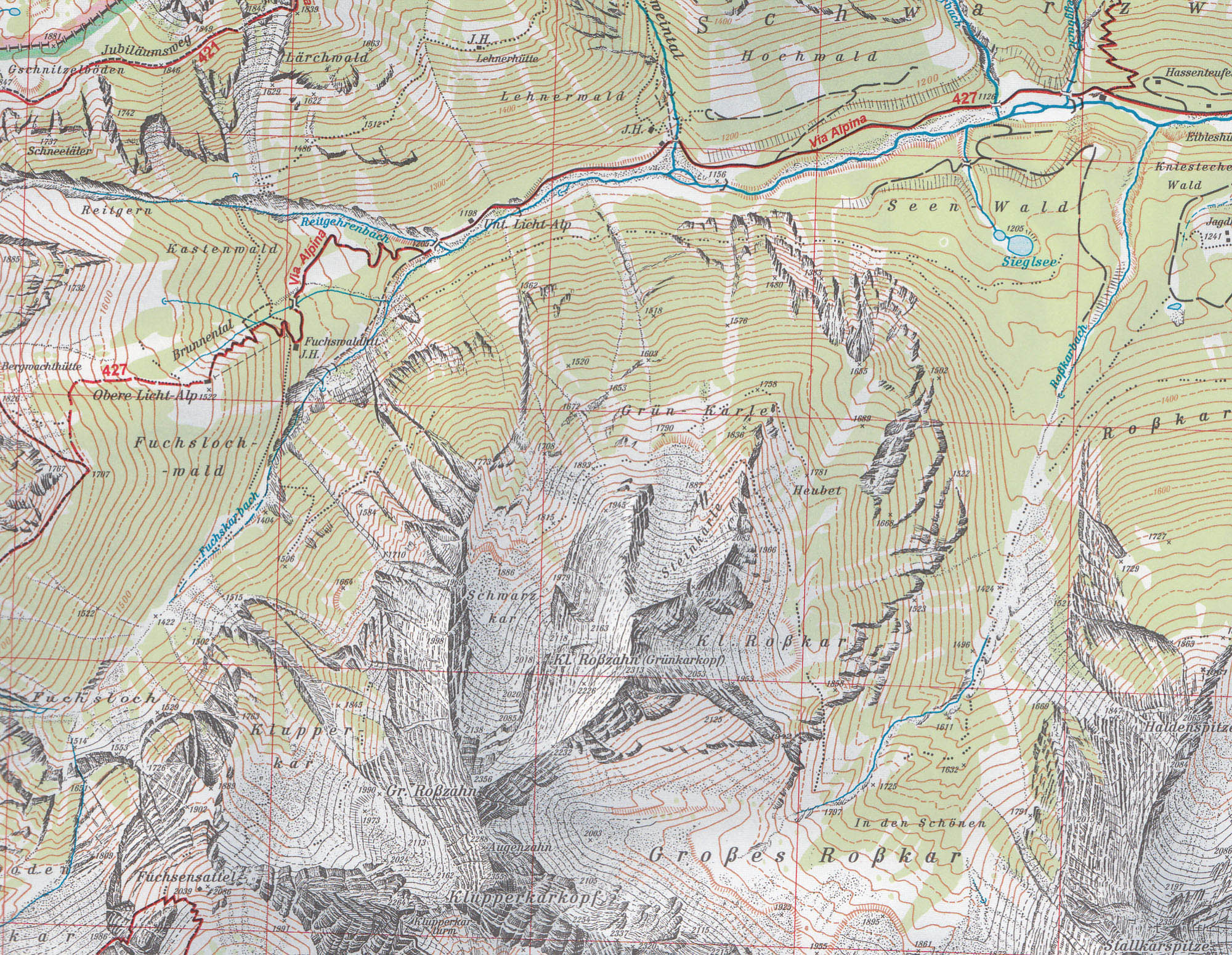 Velice podrobná mapa ze série turistických a lyžarských map vydávaných Německo-Rakouským alpským spolkem. Vrstevnice jsou zakresleny po 20 výškových metrech. Na mapě jsou vyznačeny turistické trasy s úseky fixního jištění, kempy, horské chaty a jiná ubytování. Legenda mapy je v němčině.