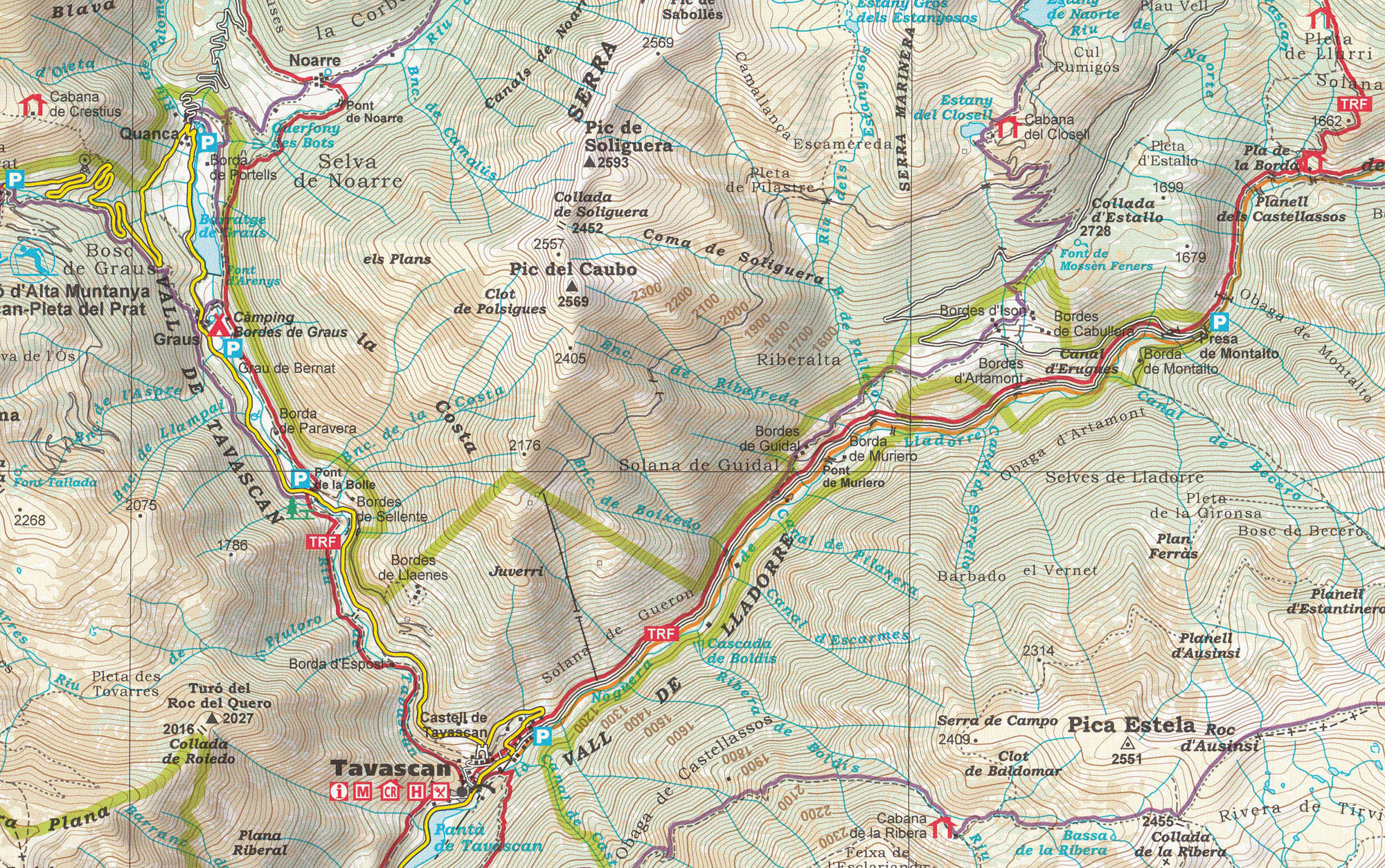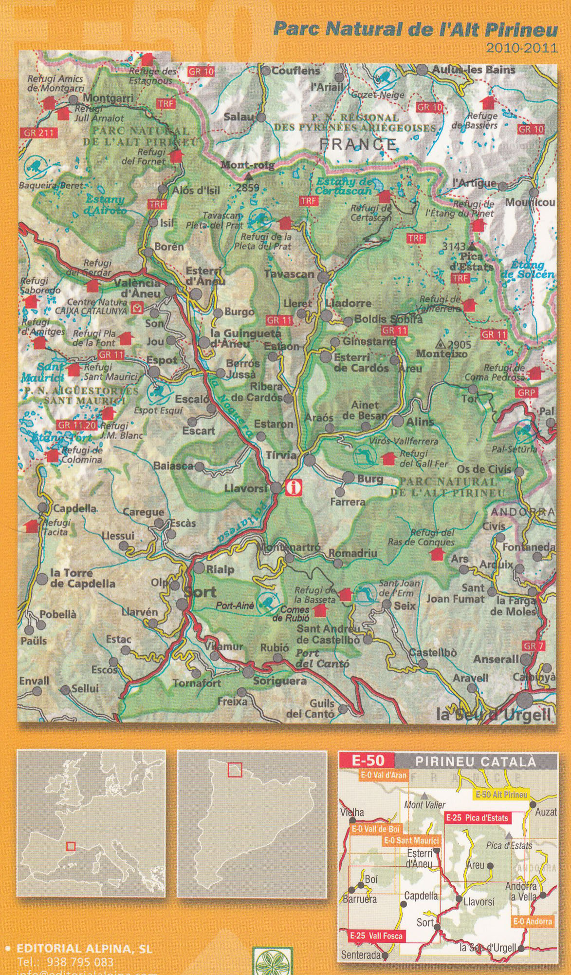 Rozsáhlá a velmi populární série pěších map od vydavatelství Alpina pokrývající Pyreneje, Katalánsko a další vybrané turistické oblasti ve Španělsku, včetně Malorky. Měřítka se pohybují od 1:50.000 do 1:10.000 - většina titulů je však v měřítku 1:25.000. Mapy mají vrstevnice, obvykle v intervalech 20 m nebo 10 m, se stínovaným reliéfem a kótami. Mapa klasicky zobrazuje turistické trasy, dálkové trasy, kempy, horské chaty, boudy, horolezecké lokality, jeskyně, trasy pro horská kola a jízdu na koni a lyžařská střediska.Všechny nejnovější verze mají UTM systém a značení zeměpisné šířky a délky v intervalu 1 ". Legenda u všech titulů zahrnuje angličtinu.Každý titul má samostatnou brožuru s obecnými informacemi o oblasti, popisy vybraných turistických tras, seznam ubytování s adresami, atd. Ne u všech titulů je to včetně angličtiny – raději se ptejte.