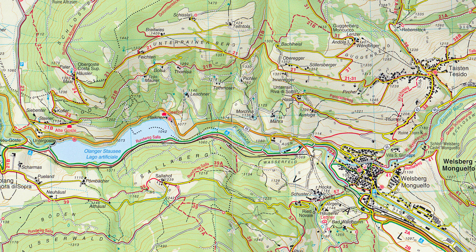 vrstevnice po 25m, stínovaný reliéf, značeny všechny druhy tras včetně "Alte Vie" a "via feratta", ubytování, lanovky, zajímavá místa atd. WGS 84