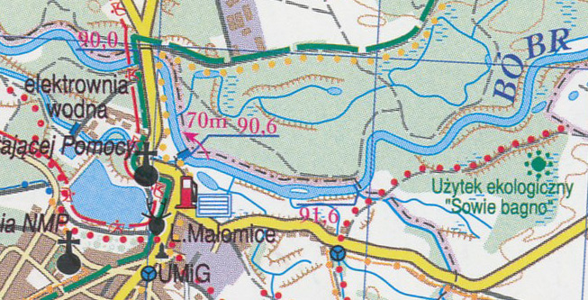 Mapa má vrstevnice v intervalu 10 m, zalesněné oblasti jsou vyznačeny zeleně. Turisticky významná místa jsou zvýrazněna. Zakresleny jsou cyklotrasy a značené turistické trasy. Na řece Bóbr je vyznačena kilomeráž a další vodácké informace.
