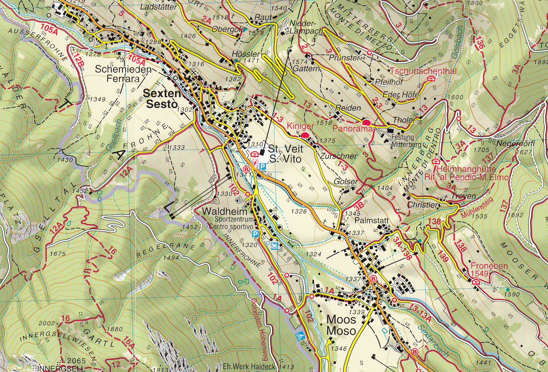 vrstevnice po 25m, stínovaný reliéf, značeny všechny druhy tras včetně "Alte Vie" a "via feratta", ubytování, lanovky, zajímavá místa atd. WGS 84