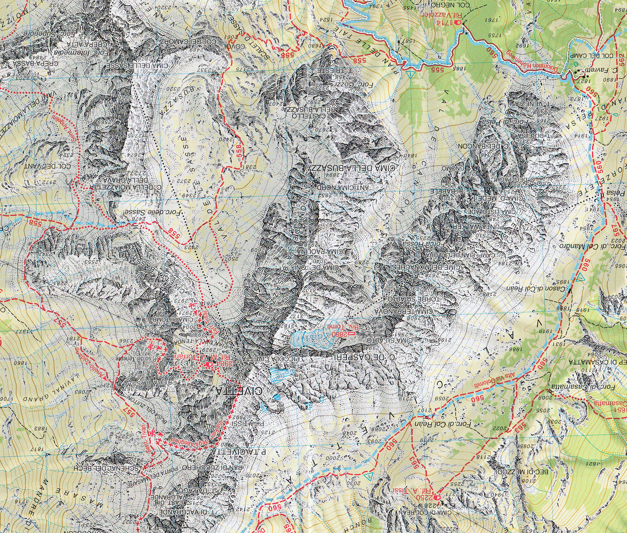 vrstevnice po 25m, stínovaný reliéf, značeny všechny druhy tras včetně "Alte Vie" a "via feratta", ubytování, lanovky, zajímavá místa atd. WGS 84