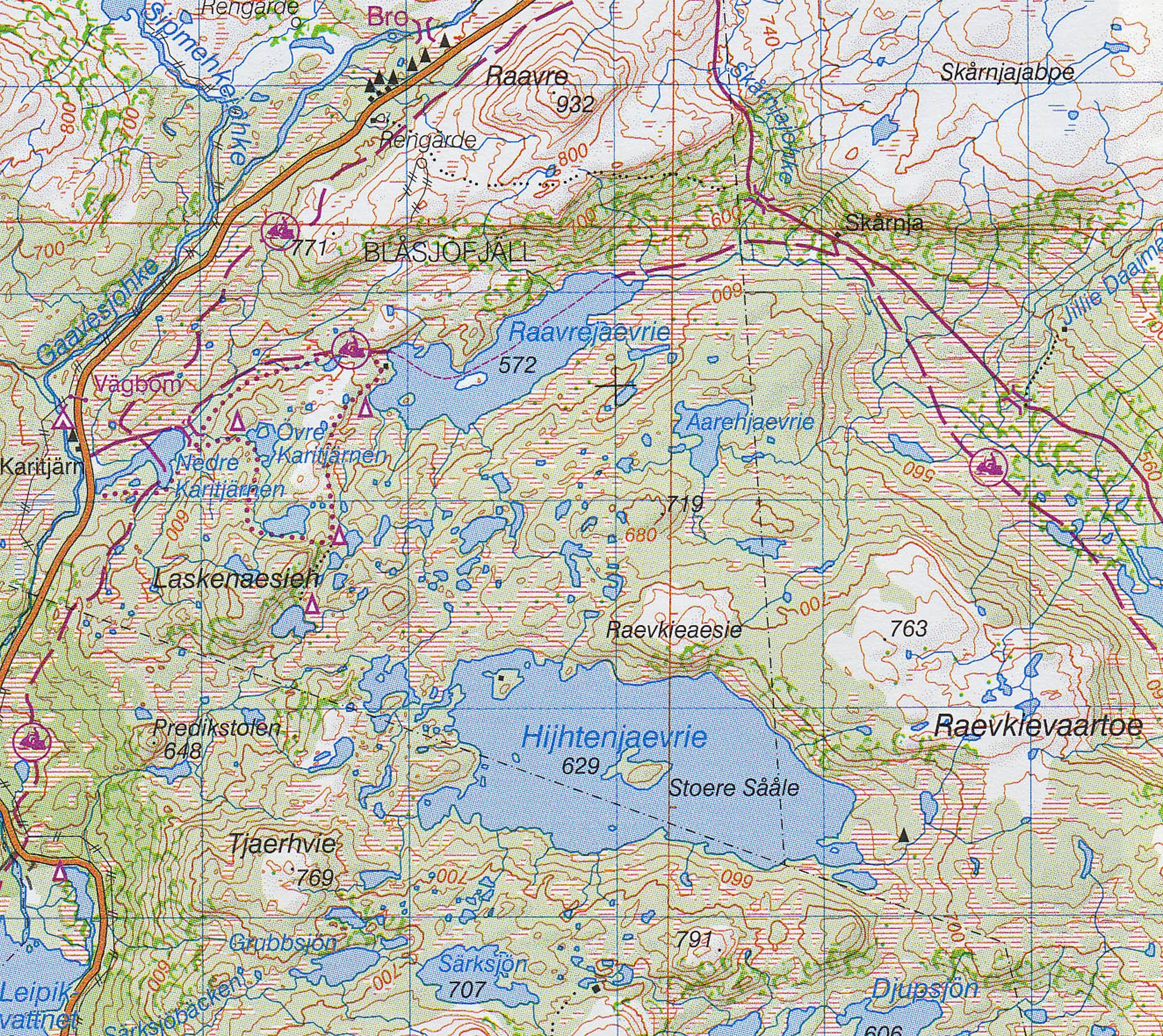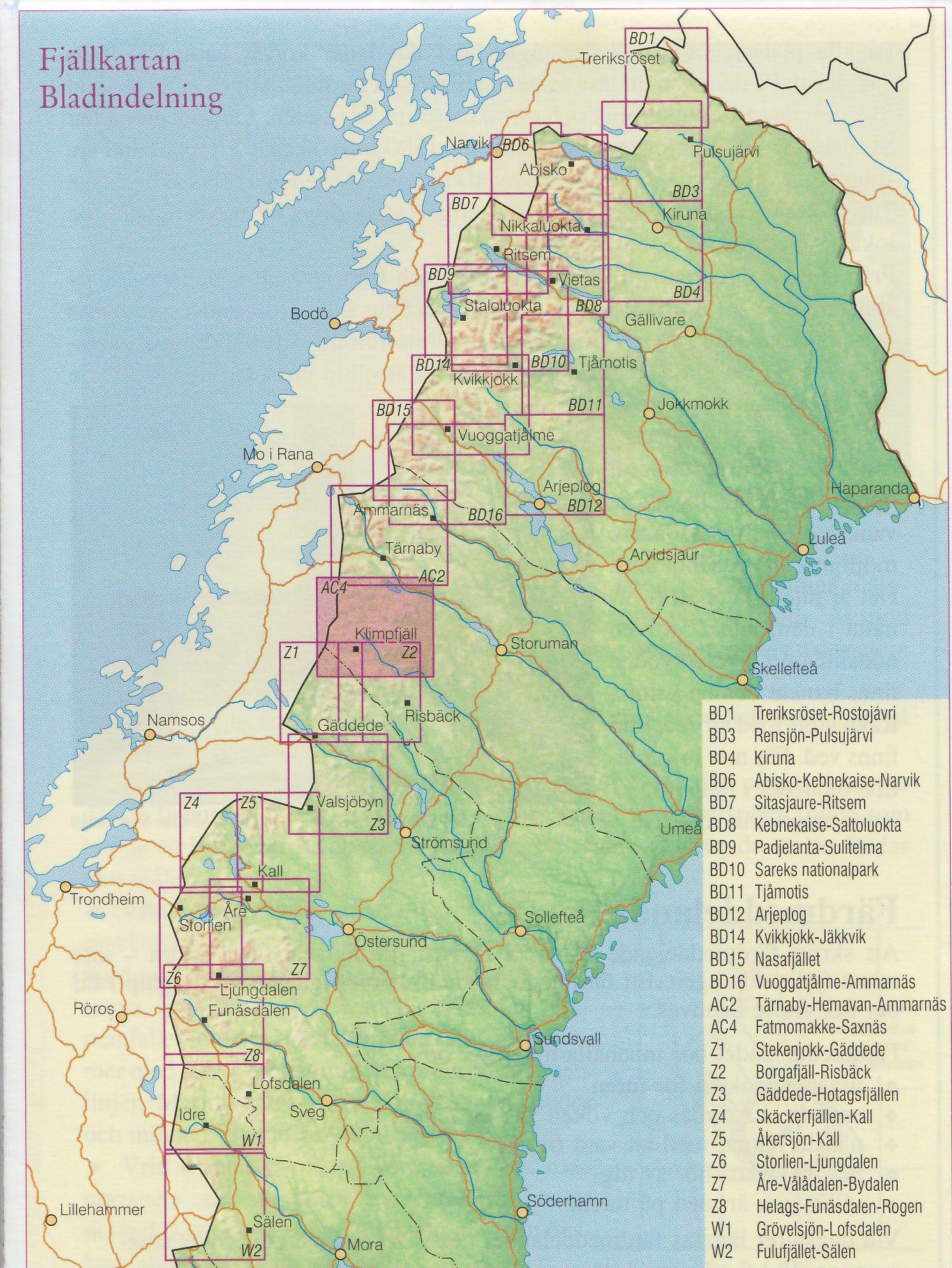 Turistická mapa ze série podrobných topografických map horských oblastí středního a severního Švédska. Vrstevnice jsou zobrazeny v intervalu 20 m a celý reliéf je opatřen stínováním. V mapě naleznete vyznačené trasy pro pěší turistiku a běžecké lyžování, trasy určené pro jízdu na sněžném skůtru, kempy, ubytovny a ostatní druhy ubytování atd. Každý list pokrývá oblast přibližně 80 x 80 km, nebo větší. Mapy obsahují UTM souřadnice a souřadnice zeměpisné šířky a délky po 10'. Legenda mapy je také v angličtině a popisy oblasti na rubu mapy pouze ve švédštině. Některé z listů navíc obsahují stručné poznámky v angličtině ohledně zón s omezeným vstupem.