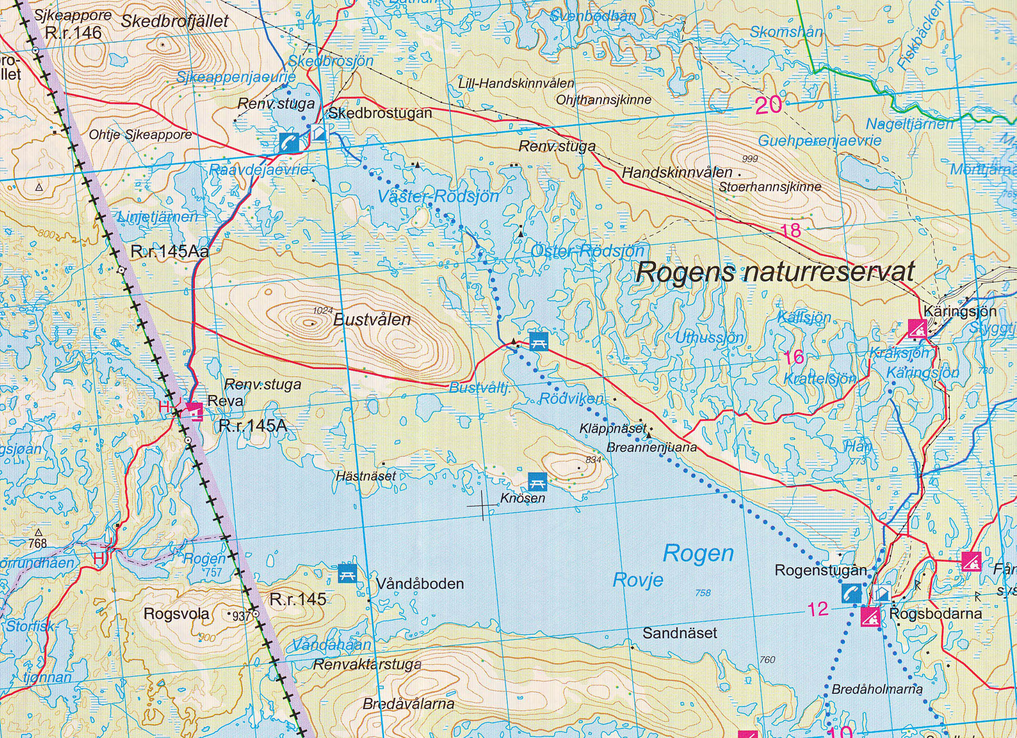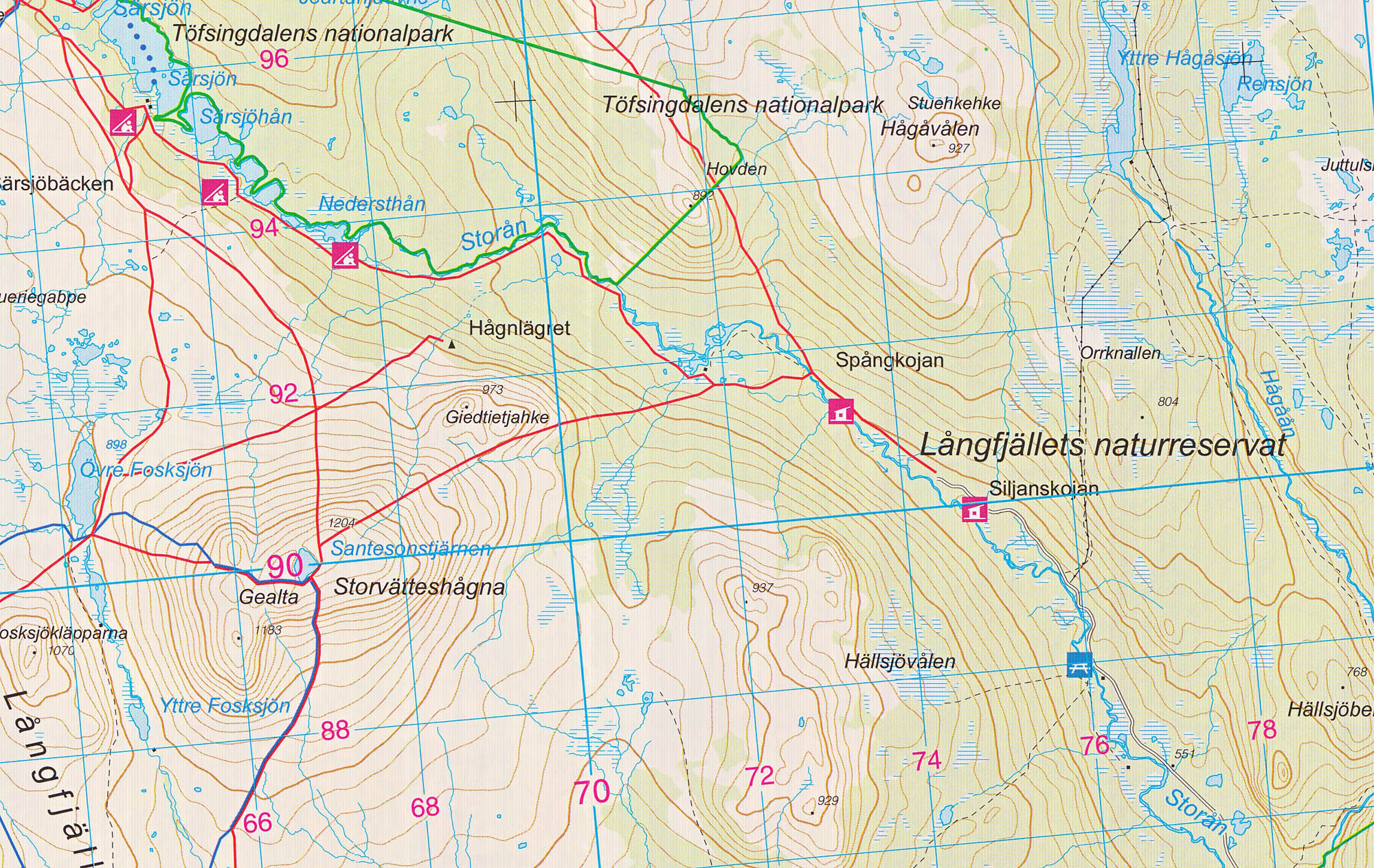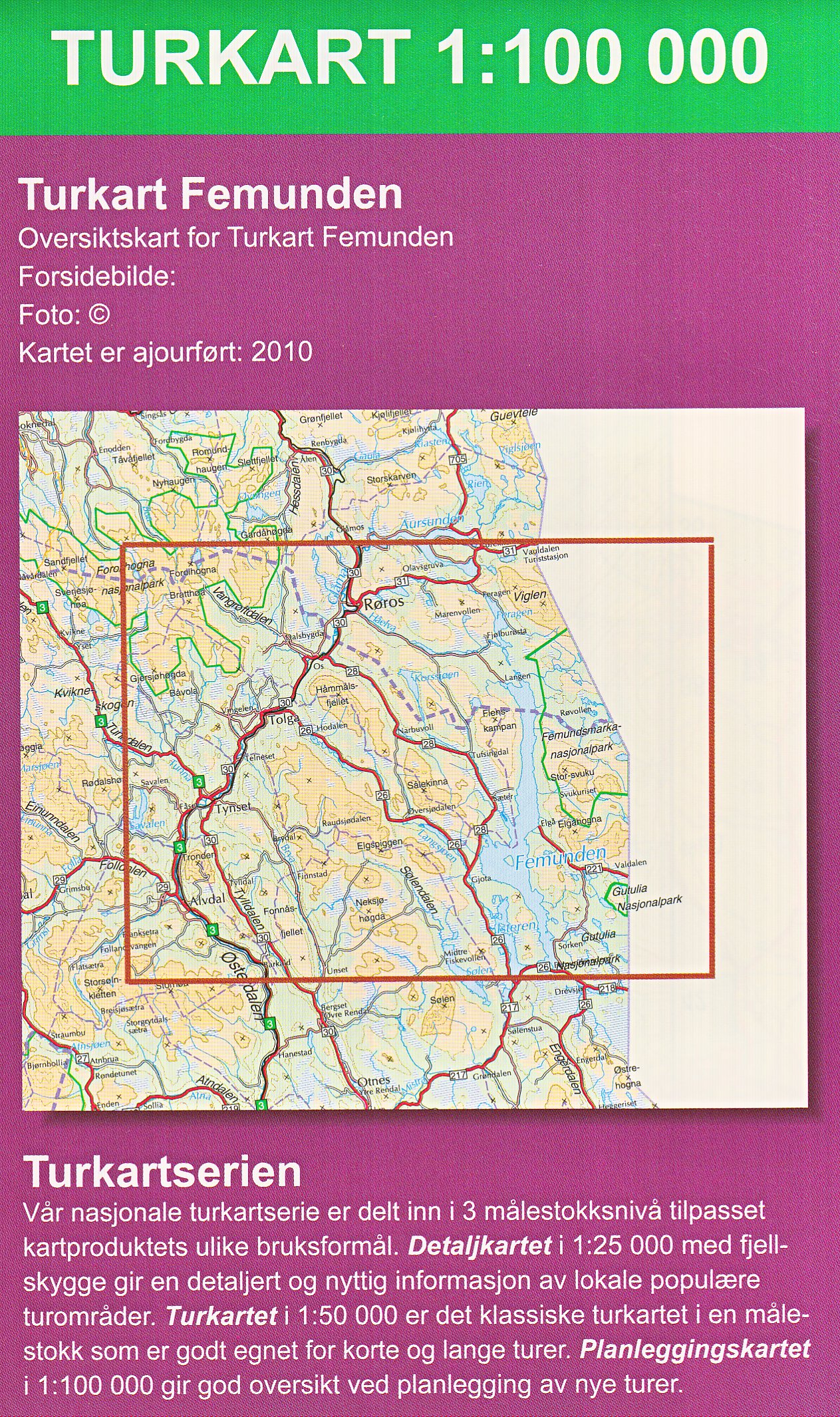 Mapa ze série GPS kompatibilních turistických map v měřítku 1:50.000/1:100.000. Vrstevnice jsou po 20m. Mapy zobrazují veškeré cesty a stezky, horské chaty a kempy, cyklistické nebo lyžařské trasy, jiné možnosti ubytování, sportovní a rekreační zařízení, sjezdovky, zajímavá místa, ledovce atd. (viz. legenda) Mapy mají UTM grid a na okrajích značenou zeměpisnou šířku a délku. Legenda mapy je norsky a anglicky. Některé tituly mají na rubové straně další turistické informace, i když ve většině případů pouze norsky. Od 1.1.2014 je doporučená maloobchodní cena těchto map na norském trhu 199,- NOK (vč. DPH 25%).