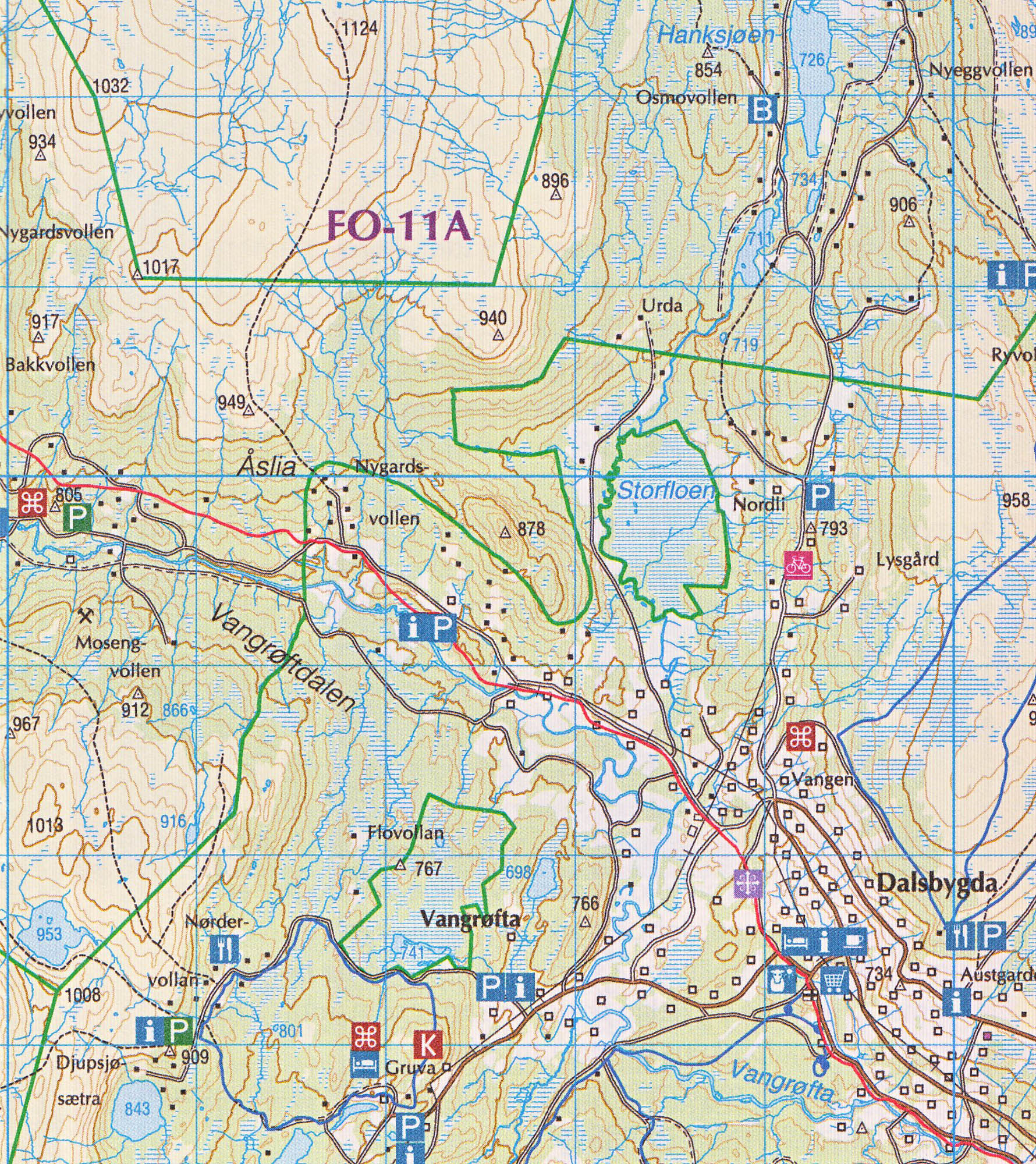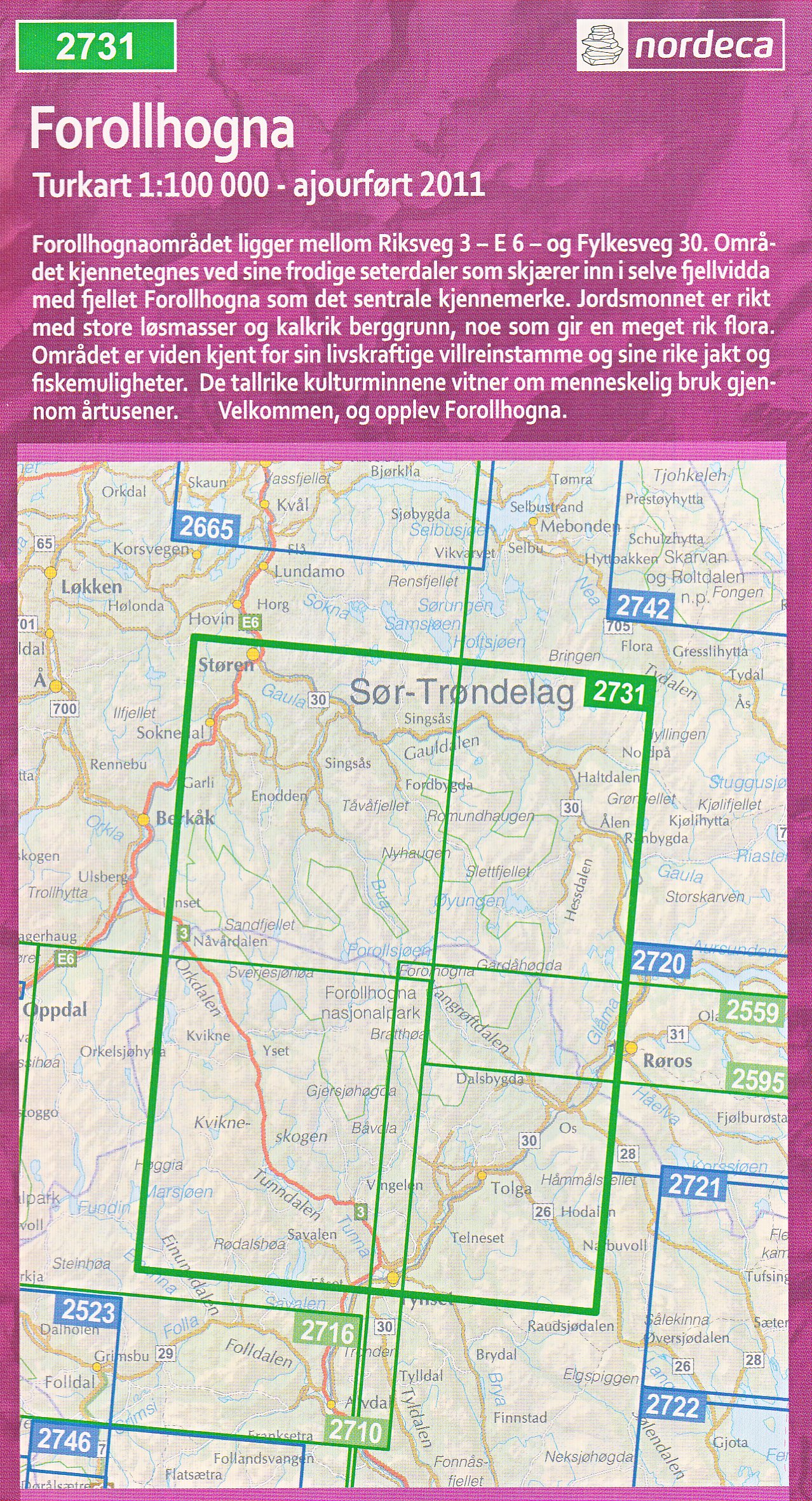 Mapa ze série GPS kompatibilních turistických map v měřítku 1:50.000/1:100.000. Vrstevnice jsou po 20m. Mapy zobrazují veškeré cesty a stezky, horské chaty a kempy, cyklistické nebo lyžařské trasy, jiné možnosti ubytování, sportovní a rekreační zařízení, sjezdovky, zajímavá místa, ledovce atd. (viz. legenda) Mapy mají UTM grid a na okrajích značenou zeměpisnou šířku a délku. Legenda mapy je norsky a anglicky. Některé tituly mají na rubové straně další turistické informace, i když ve většině případů pouze norsky. Od 1.1.2014 je doporučená maloobchodní cena těchto map na norském trhu 199,- NOK (vč. DPH 25%).