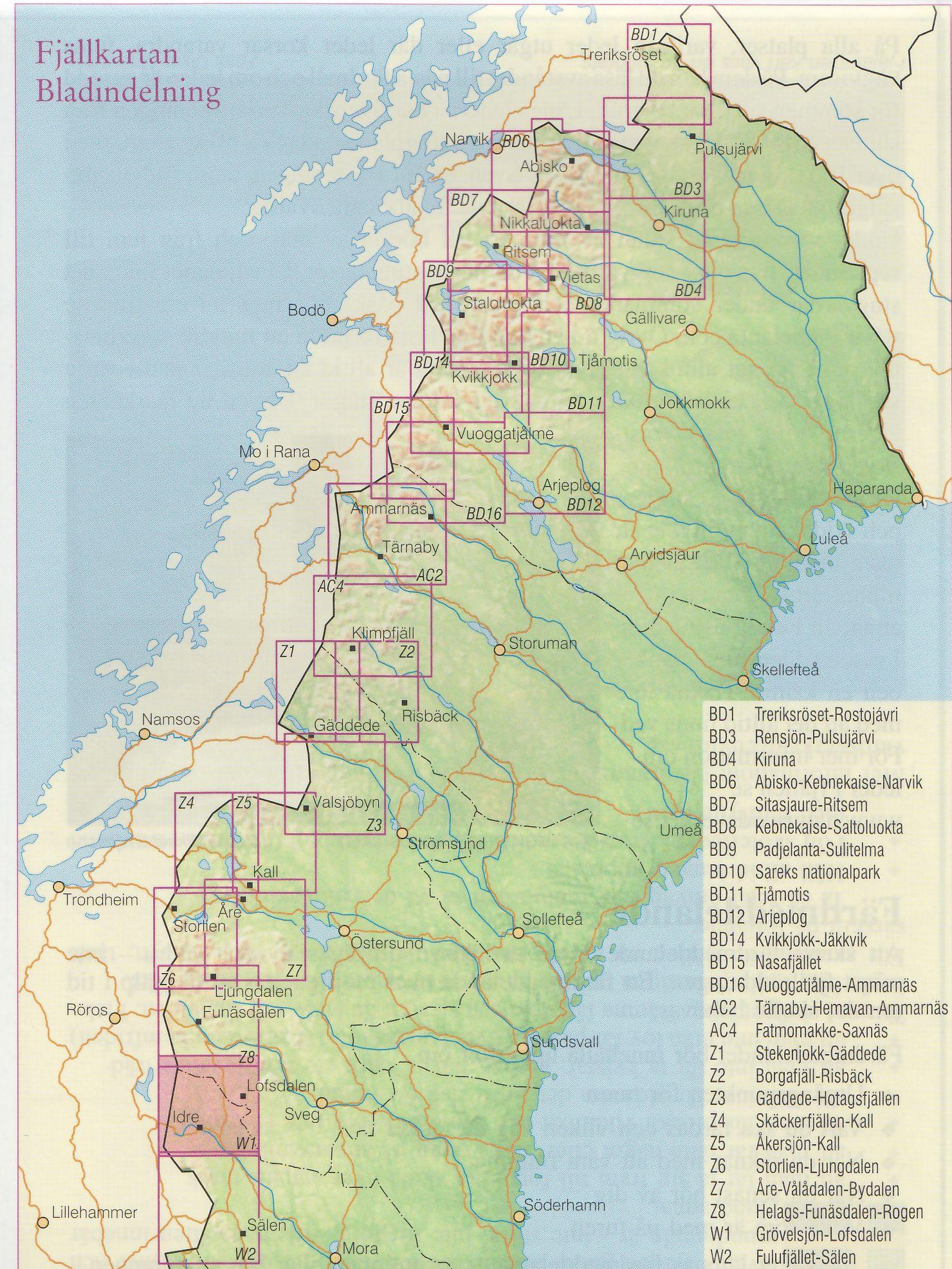 Turistická mapa ze série podrobných topografických map horských oblastí středního a severního Švédska. Vrstevnice jsou zobrazeny v intervalu 20 m a celý reliéf je opatřen stínováním. V mapě naleznete vyznačené trasy pro pěší turistiku a běžecké lyžování, trasy určené pro jízdu na sněžném skůtru, kempy, ubytovny a ostatní druhy ubytování atd. Každý list pokrývá oblast přibližně 80 x 80 km, nebo větší. Mapy obsahují UTM souřadnice a souřadnice zeměpisné šířky a délky po 10'. Legenda mapy je také v angličtině a popisy oblasti na rubu mapy pouze ve švédštině. Některé z listů navíc obsahují stručné poznámky v angličtině ohledně zón s omezeným vstupem.