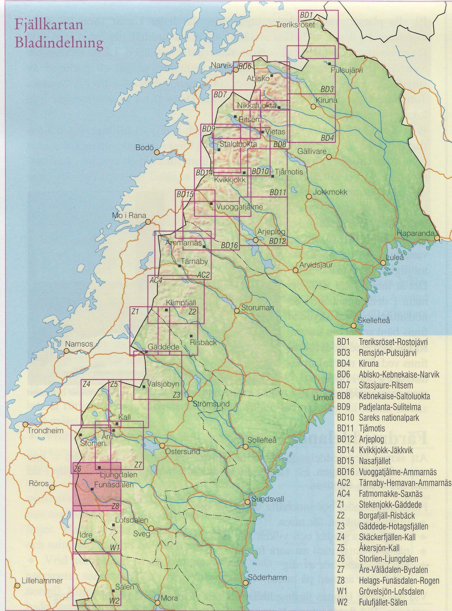 Turistická mapa ze série podrobných topografických map horských oblastí středního a severního Švédska. Vrstevnice jsou zobrazeny v intervalu 20 m a celý reliéf je opatřen stínováním. V mapě naleznete vyznačené trasy pro pěší turistiku a běžecké lyžování, trasy určené pro jízdu na sněžném skůtru, kempy, ubytovny a ostatní druhy ubytování atd. Každý list pokrývá oblast přibližně 80 x 80 km, nebo větší. Mapy obsahují UTM souřadnice a souřadnice zeměpisné šířky a délky po 10'. Legenda mapy je také v angličtině a popisy oblasti na rubu mapy pouze ve švédštině. Některé z listů navíc obsahují stručné poznámky v angličtině ohledně zón s omezeným vstupem.