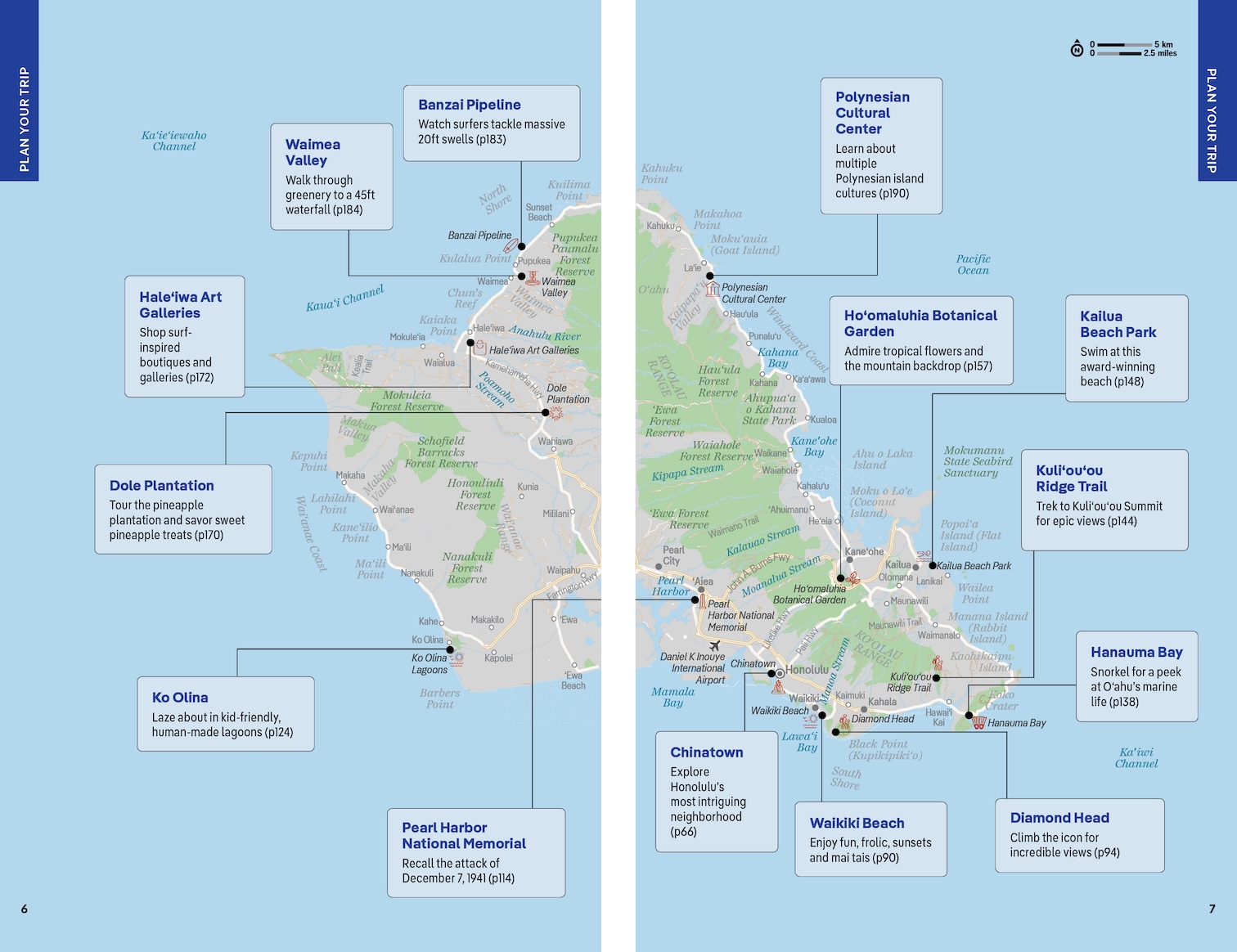 Special features on exploring Pearl Harbor, surfing North Shore, and kayaking Mokulua Islands