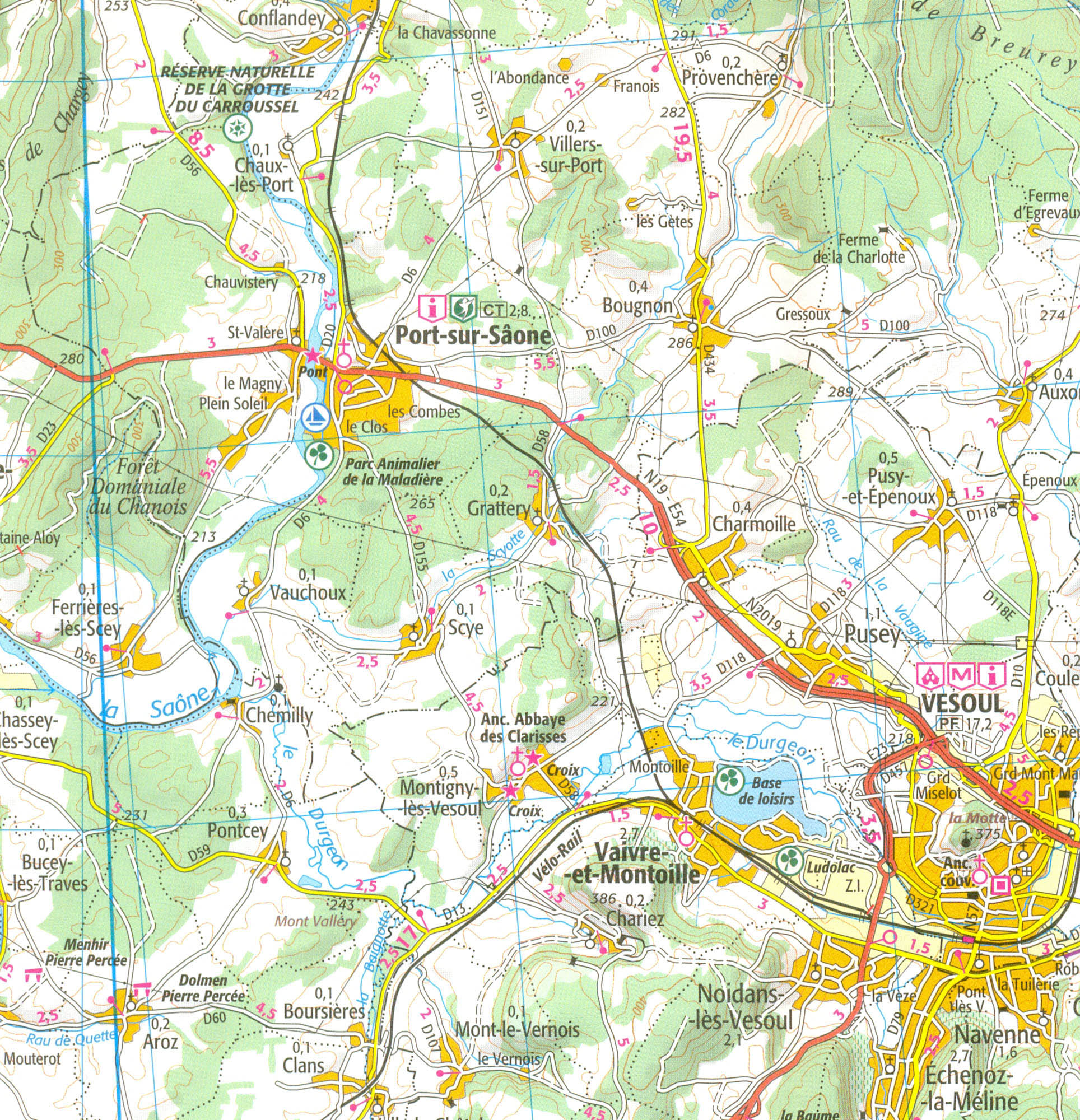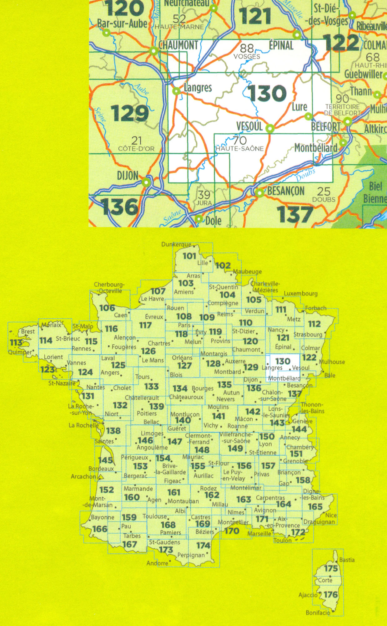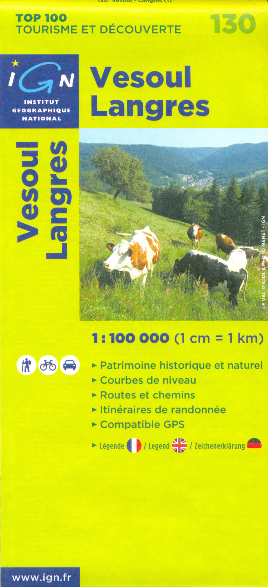 Mapa ze série TOP100 cykloturistických map Francie od Institut Géographique National (IGN), výjimečně detailní stínované mapy, ideální pro objevování francouzského venkova autem, na kole, nebo dokonce pěšky. Používána miliony místních turistů, série nabízí vynikající rovnováhu mezi pokrytím dostatečně velké oblasti a detailním zobrazením. V únoru 2010 tato série (dříve známá jako série Verte) prošla kompletní revizí a poskytuje tak ještě přesnější zobrazení místních komunikací a nově zahrnuje GPS souřadnice. Interval vrstevnic se liší v závislosti na terénu od 10 metrů podél pobřeží do hloubky až po 40 metrů v horských oblastech. Zbarvení mapy ukazuje různé typy vegetace a půdní využití (lesy, vinice, ovocné sady, atd.). Mapy mají 5 km UTM pro uživatele GPS plus značení zeměpisné šířky a délky v 15' intervalech. Obsahují mnoho turistických informací -značené stezky, GR trasy, různé zajímavosti, sportovní a rekreační zařízení, horské boudy, Gîtes d'etape, vrcholy, ledovce, průsmyky, názvy hor, železnice se stanicemi, lanovky, vleky, administrativní hranice, atd. Legenda obsahuje angličtinu.