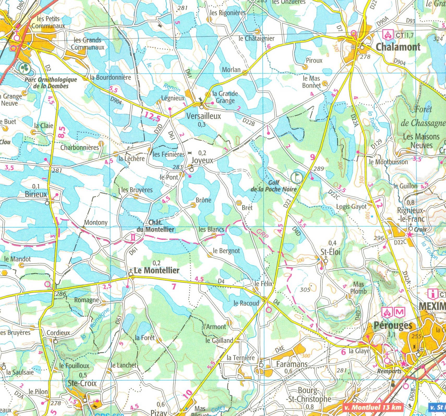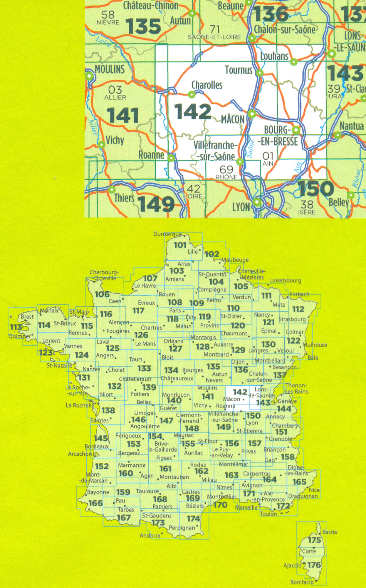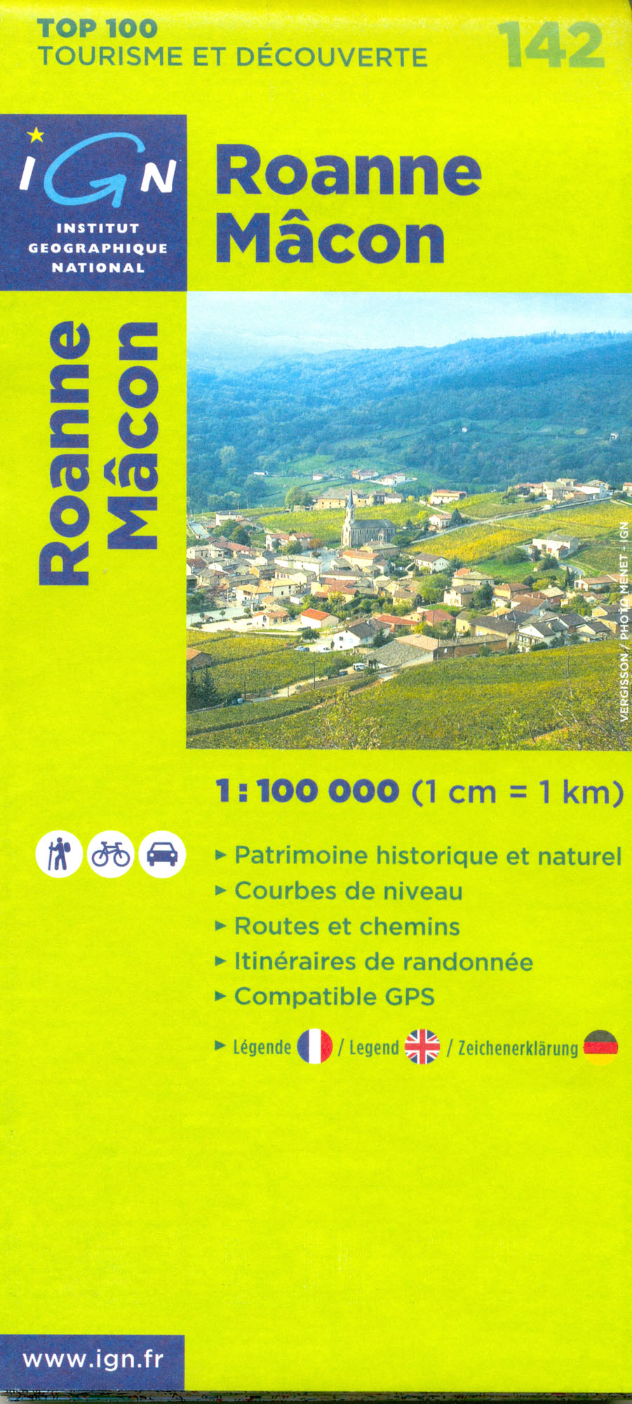 Mapa ze série TOP100 cykloturistických map Francie od Institut Géographique National (IGN), výjimečně detailní stínované mapy, ideální pro objevování francouzského venkova autem, na kole, nebo dokonce pěšky. Používána miliony místních turistů, série nabízí vynikající rovnováhu mezi pokrytím dostatečně velké oblasti a detailním zobrazením. V únoru 2010 tato série (dříve známá jako série Verte) prošla kompletní revizí a poskytuje tak ještě přesnější zobrazení místních komunikací a nově zahrnuje GPS souřadnice. Interval vrstevnic se liší v závislosti na terénu od 10 metrů podél pobřeží do hloubky až po 40 metrů v horských oblastech. Zbarvení mapy ukazuje různé typy vegetace a půdní využití (lesy, vinice, ovocné sady, atd.). Mapy mají 5 km UTM pro uživatele GPS plus značení zeměpisné šířky a délky v 15' intervalech. Obsahují mnoho turistických informací -značené stezky, GR trasy, různé zajímavosti, sportovní a rekreační zařízení, horské boudy, Gîtes d'etape, vrcholy, ledovce, průsmyky, názvy hor, železnice se stanicemi, lanovky, vleky, administrativní hranice, atd. Legenda obsahuje angličtinu.
