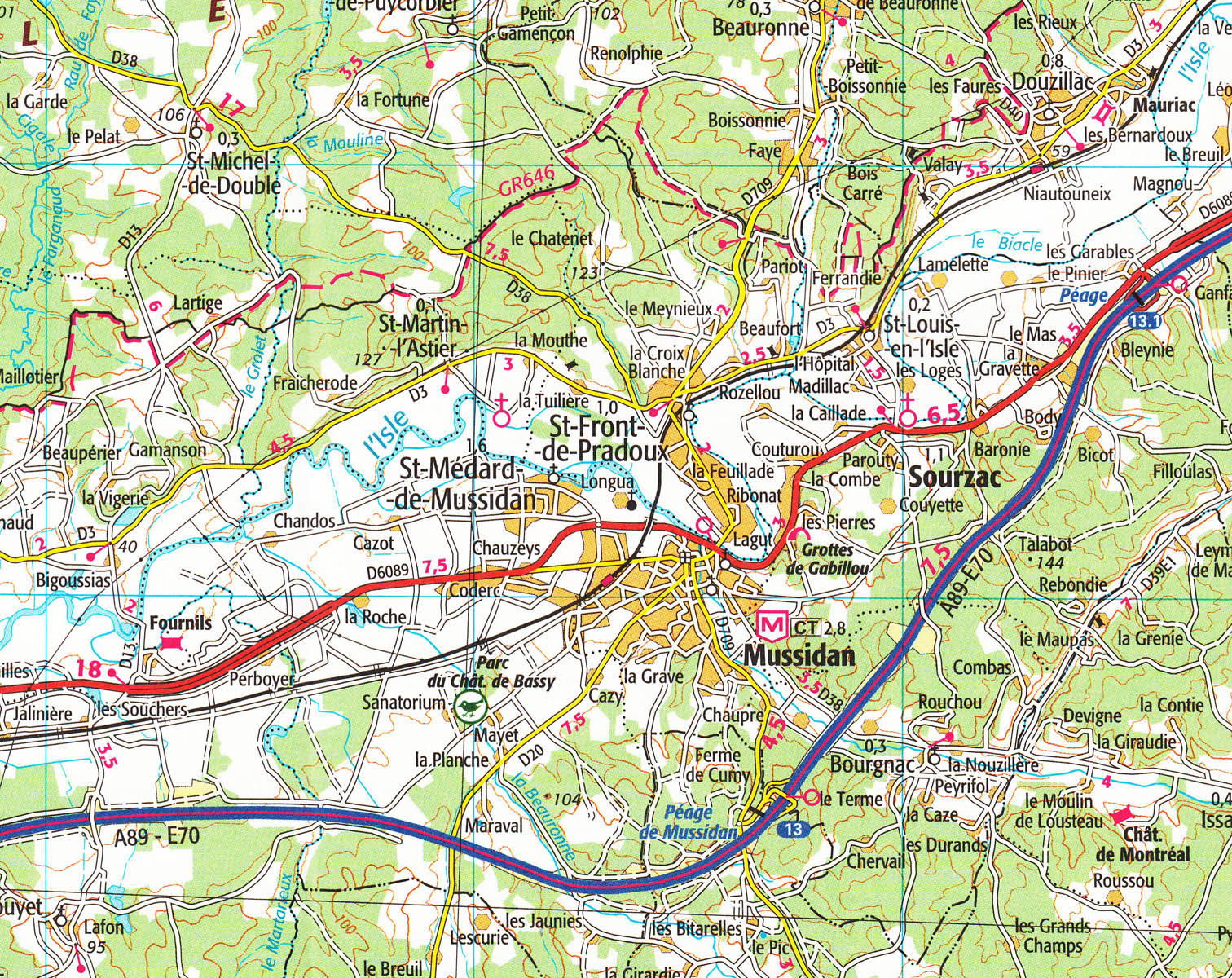 Mapa ze série TOP100 cykloturistických map Francie od Institut Géographique National (IGN), výjimečně detailní stínované mapy, ideální pro objevování francouzského venkova autem, na kole, nebo dokonce pěšky. Používána miliony místních turistů, série nabízí vynikající rovnováhu mezi pokrytím dostatečně velké oblasti a detailním zobrazením. V únoru 2010 tato série (dříve známá jako série Verte) prošla kompletní revizí a poskytuje tak ještě přesnější zobrazení místních komunikací a nově zahrnuje GPS souřadnice. Interval vrstevnic se liší v závislosti na terénu od 10 metrů podél pobřeží do hloubky až po 40 metrů v horských oblastech. Zbarvení mapy ukazuje různé typy vegetace a půdní využití (lesy, vinice, ovocné sady, atd.). Mapy mají 5 km UTM pro uživatele GPS plus značení zeměpisné šířky a délky v 15' intervalech. Obsahují mnoho turistických informací -značené stezky, GR trasy, různé zajímavosti, sportovní a rekreační zařízení, horské boudy, Gîtes d'etape, vrcholy, ledovce, průsmyky, názvy hor, železnice se stanicemi, lanovky, vleky, administrativní hranice, atd. Legenda obsahuje angličtinu.