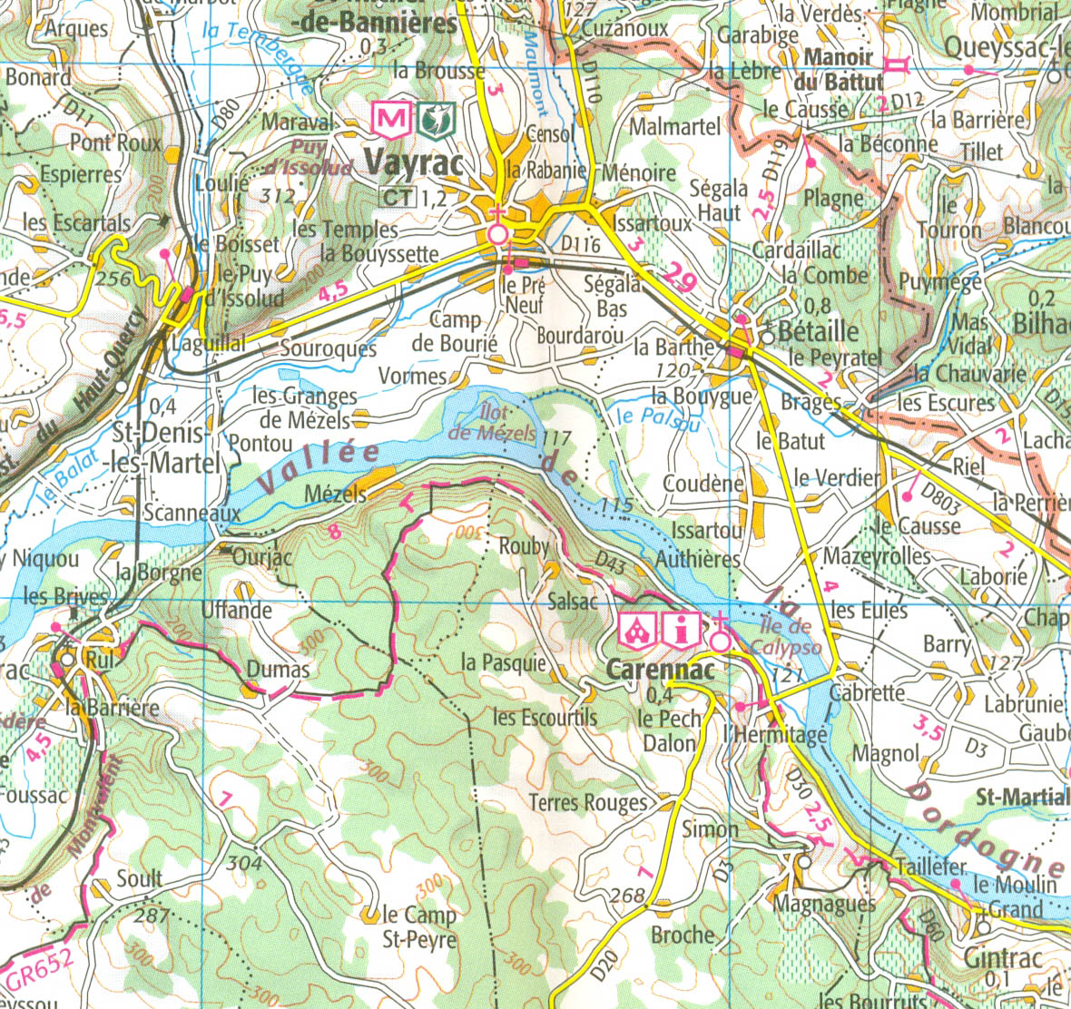 Mapa ze série TOP100 cykloturistických map Francie od Institut Géographique National (IGN), výjimečně detailní stínované mapy, ideální pro objevování francouzského venkova autem, na kole, nebo dokonce pěšky. Používána miliony místních turistů, série nabízí vynikající rovnováhu mezi pokrytím dostatečně velké oblasti a detailním zobrazením. V únoru 2010 tato série (dříve známá jako série Verte) prošla kompletní revizí a poskytuje tak ještě přesnější zobrazení místních komunikací a nově zahrnuje GPS souřadnice. Interval vrstevnic se liší v závislosti na terénu od 10 metrů podél pobřeží do hloubky až po 40 metrů v horských oblastech. Zbarvení mapy ukazuje různé typy vegetace a půdní využití (lesy, vinice, ovocné sady, atd.). Mapy mají 5 km UTM pro uživatele GPS plus značení zeměpisné šířky a délky v 15' intervalech. Obsahují mnoho turistických informací -značené stezky, GR trasy, různé zajímavosti, sportovní a rekreační zařízení, horské boudy, Gîtes d'etape, vrcholy, ledovce, průsmyky, názvy hor, železnice se stanicemi, lanovky, vleky, administrativní hranice, atd. Legenda obsahuje angličtinu.