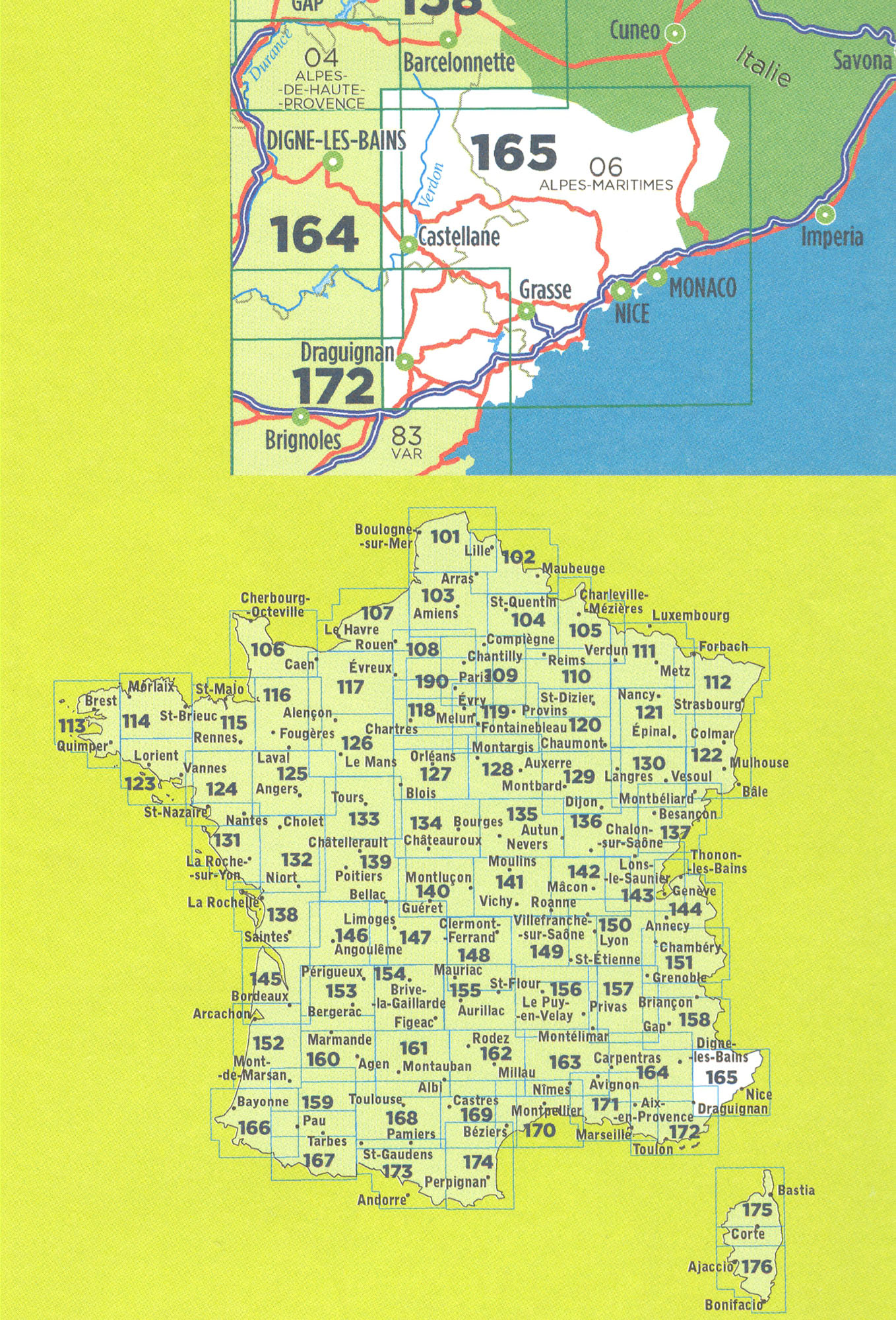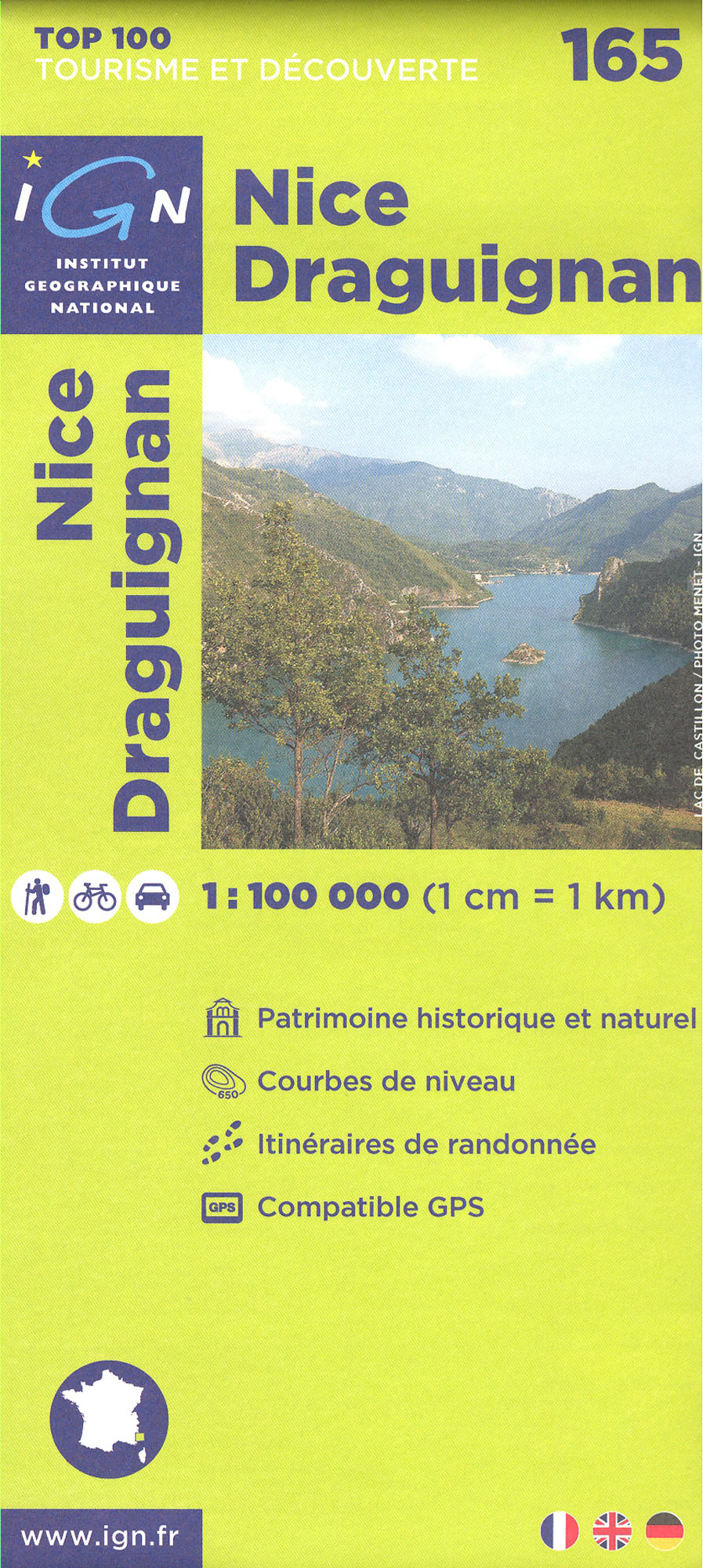 Mapa ze série TOP100 cykloturistických map Francie od Institut Géographique National (IGN), výjimečně detailní stínované mapy, ideální pro objevování francouzského venkova autem, na kole, nebo dokonce pěšky. Používána miliony místních turistů, série nabízí vynikající rovnováhu mezi pokrytím dostatečně velké oblasti a detailním zobrazením. V únoru 2010 tato série (dříve známá jako série Verte) prošla kompletní revizí a poskytuje tak ještě přesnější zobrazení místních komunikací a nově zahrnuje GPS souřadnice. Interval vrstevnic se liší v závislosti na terénu od 10 metrů podél pobřeží do hloubky až po 40 metrů v horských oblastech. Zbarvení mapy ukazuje různé typy vegetace a půdní využití (lesy, vinice, ovocné sady, atd.). Mapy mají 5 km UTM pro uživatele GPS plus značení zeměpisné šířky a délky v 15' intervalech. Obsahují mnoho turistických informací -značené stezky, GR trasy, různé zajímavosti, sportovní a rekreační zařízení, horské boudy, Gîtes d'etape, vrcholy, ledovce, průsmyky, názvy hor, železnice se stanicemi, lanovky, vleky, administrativní hranice, atd. Legenda obsahuje angličtinu.