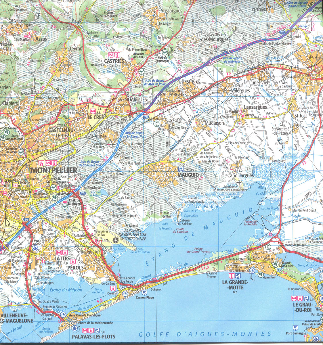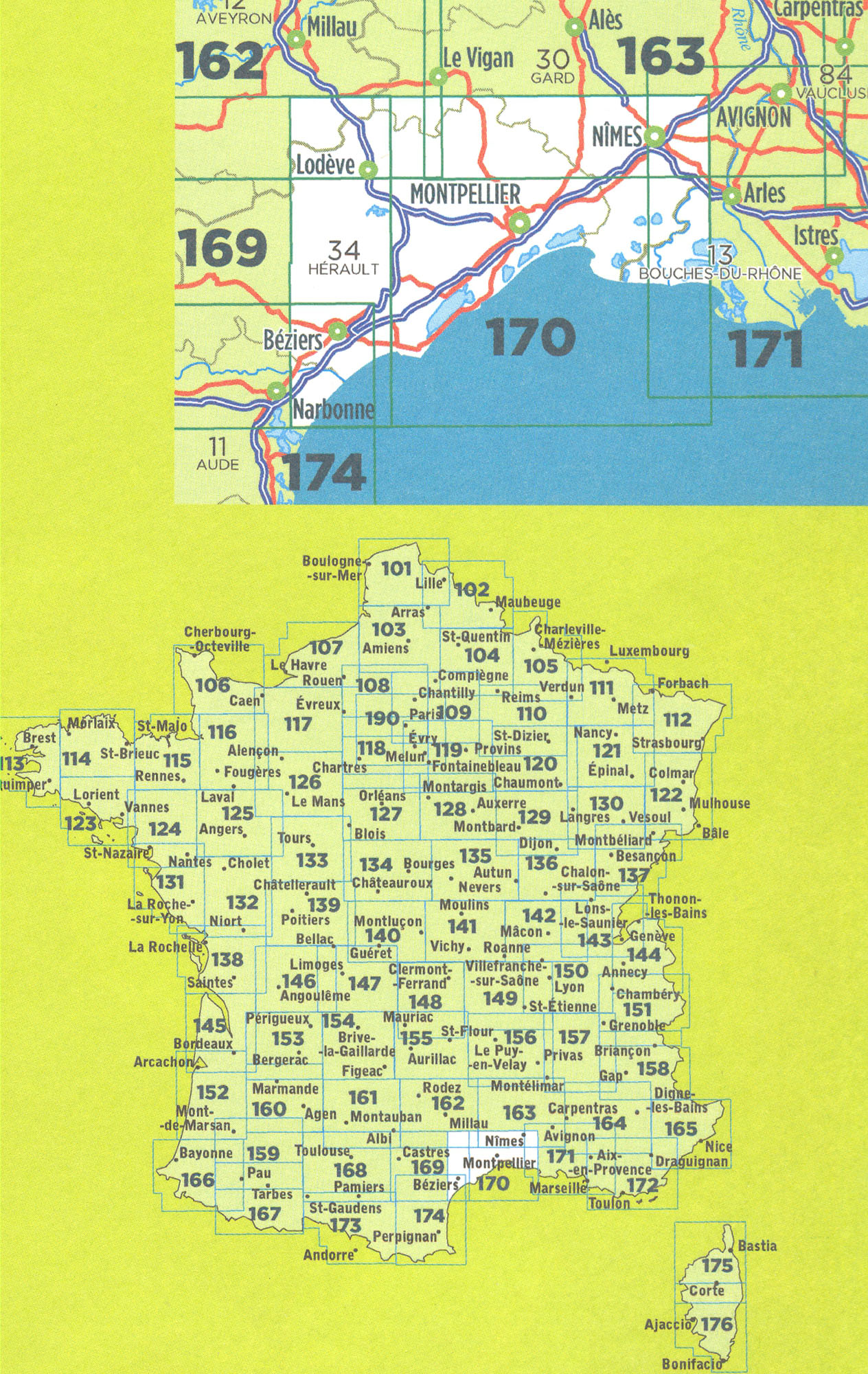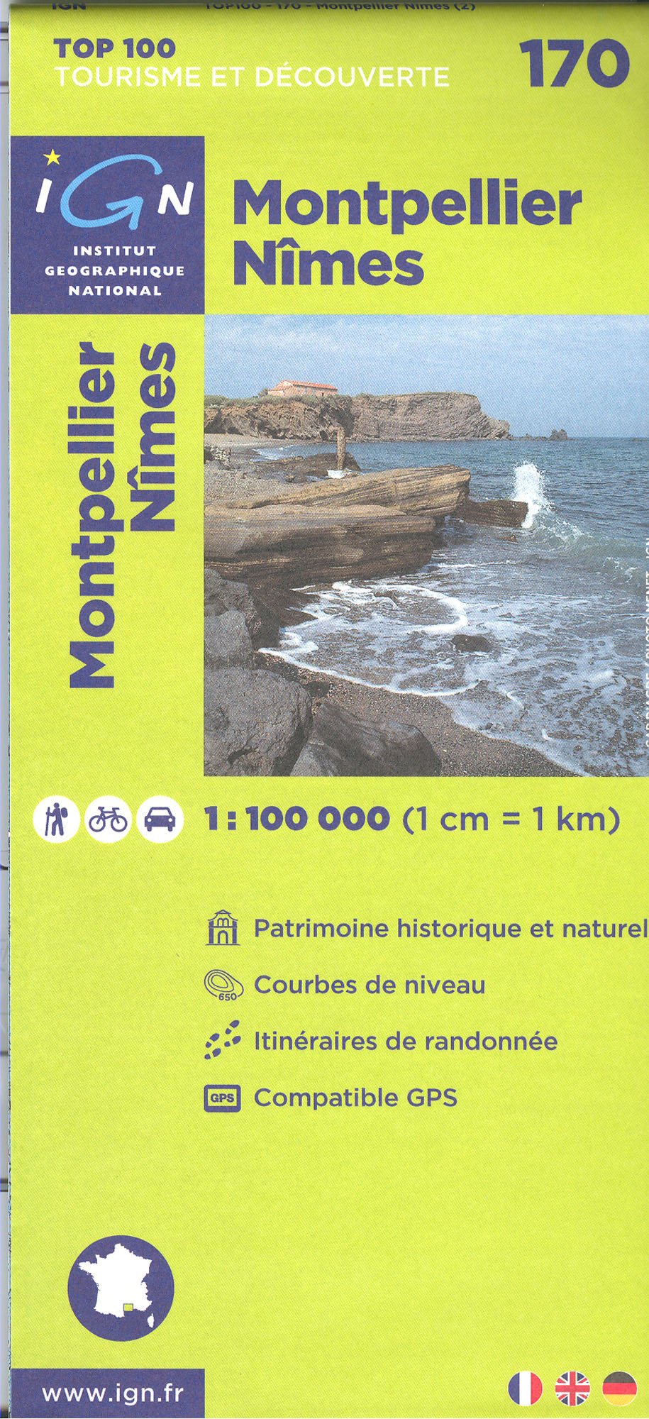 Mapa ze série TOP100 cykloturistických map Francie od Institut Géographique National (IGN), výjimečně detailní stínované mapy, ideální pro objevování francouzského venkova autem, na kole, nebo dokonce pěšky. Používána miliony místních turistů, série nabízí vynikající rovnováhu mezi pokrytím dostatečně velké oblasti a detailním zobrazením. V únoru 2010 tato série (dříve známá jako série Verte) prošla kompletní revizí a poskytuje tak ještě přesnější zobrazení místních komunikací a nově zahrnuje GPS souřadnice. Interval vrstevnic se liší v závislosti na terénu od 10 metrů podél pobřeží do hloubky až po 40 metrů v horských oblastech. Zbarvení mapy ukazuje různé typy vegetace a půdní využití (lesy, vinice, ovocné sady, atd.). Mapy mají 5 km UTM pro uživatele GPS plus značení zeměpisné šířky a délky v 15' intervalech. Obsahují mnoho turistických informací -značené stezky, GR trasy, různé zajímavosti, sportovní a rekreační zařízení, horské boudy, Gîtes d'etape, vrcholy, ledovce, průsmyky, názvy hor, železnice se stanicemi, lanovky, vleky, administrativní hranice, atd. Legenda obsahuje angličtinu.