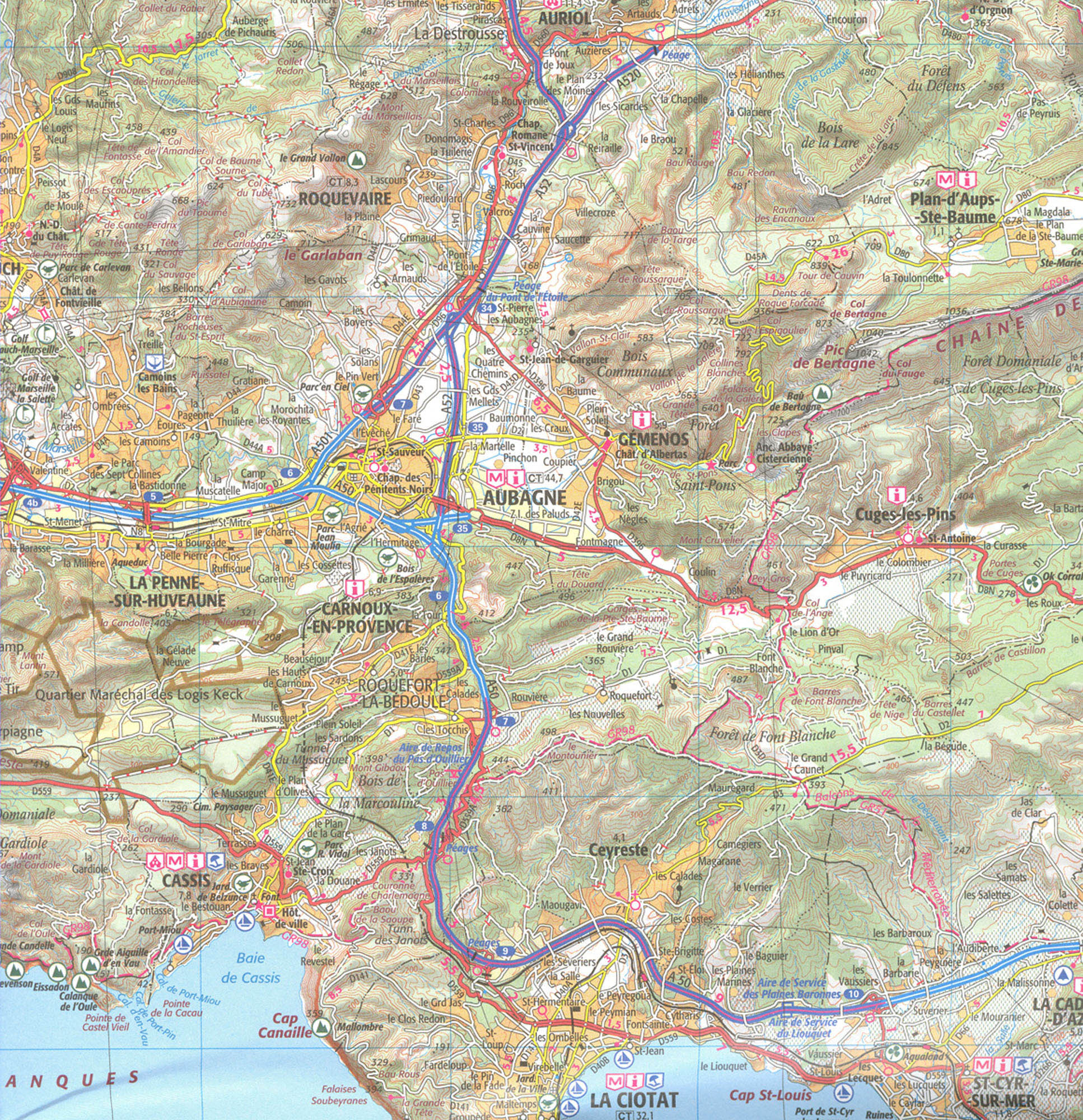 Mapa ze série TOP100 cykloturistických map Francie od Institut Géographique National (IGN), výjimečně detailní stínované mapy, ideální pro objevování francouzského venkova autem, na kole, nebo dokonce pěšky. Používána miliony místních turistů, série nabízí vynikající rovnováhu mezi pokrytím dostatečně velké oblasti a detailním zobrazením. V únoru 2010 tato série (dříve známá jako série Verte) prošla kompletní revizí a poskytuje tak ještě přesnější zobrazení místních komunikací a nově zahrnuje GPS souřadnice. Interval vrstevnic se liší v závislosti na terénu od 10 metrů podél pobřeží do hloubky až po 40 metrů v horských oblastech. Zbarvení mapy ukazuje různé typy vegetace a půdní využití (lesy, vinice, ovocné sady, atd.). Mapy mají 5 km UTM pro uživatele GPS plus značení zeměpisné šířky a délky v 15' intervalech. Obsahují mnoho turistických informací -značené stezky, GR trasy, různé zajímavosti, sportovní a rekreační zařízení, horské boudy, Gîtes d'etape, vrcholy, ledovce, průsmyky, názvy hor, železnice se stanicemi, lanovky, vleky, administrativní hranice, atd. Legenda obsahuje angličtinu.