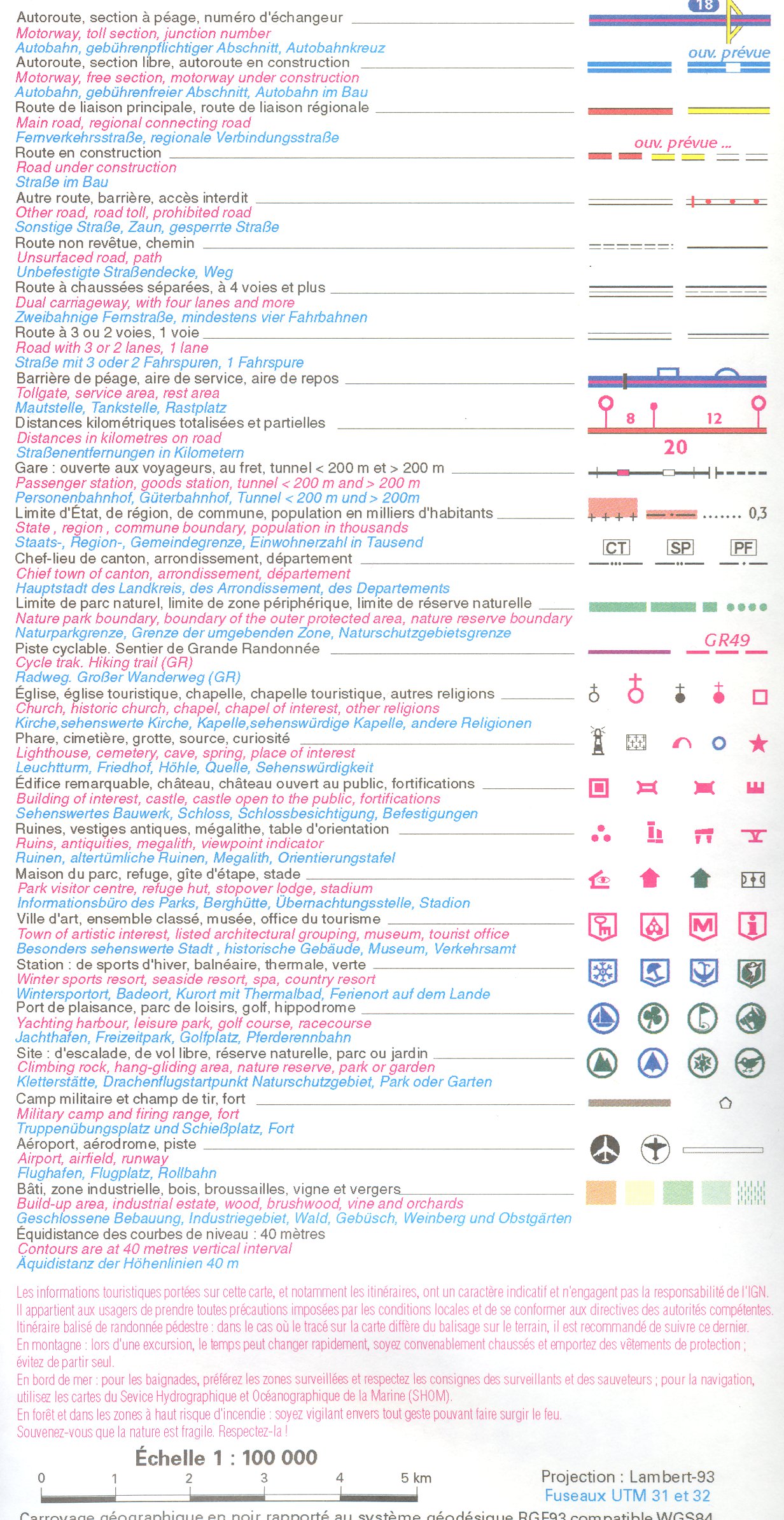 Mapa ze série TOP100 cykloturistických map Francie od Institut Géographique National (IGN), výjimečně detailní stínované mapy, ideální pro objevování francouzského venkova autem, na kole, nebo dokonce pěšky. Používána miliony místních turistů, série nabízí vynikající rovnováhu mezi pokrytím dostatečně velké oblasti a detailním zobrazením. V únoru 2010 tato série (dříve známá jako série Verte) prošla kompletní revizí a poskytuje tak ještě přesnější zobrazení místních komunikací a nově zahrnuje GPS souřadnice. Interval vrstevnic se liší v závislosti na terénu od 10 metrů podél pobřeží do hloubky až po 40 metrů v horských oblastech. Zbarvení mapy ukazuje různé typy vegetace a půdní využití (lesy, vinice, ovocné sady, atd.). Mapy mají 5 km UTM pro uživatele GPS plus značení zeměpisné šířky a délky v 15' intervalech. Obsahují mnoho turistických informací -značené stezky, GR trasy, různé zajímavosti, sportovní a rekreační zařízení, horské boudy, Gîtes d'etape, vrcholy, ledovce, průsmyky, názvy hor, železnice se stanicemi, lanovky, vleky, administrativní hranice, atd. Legenda obsahuje angličtinu.