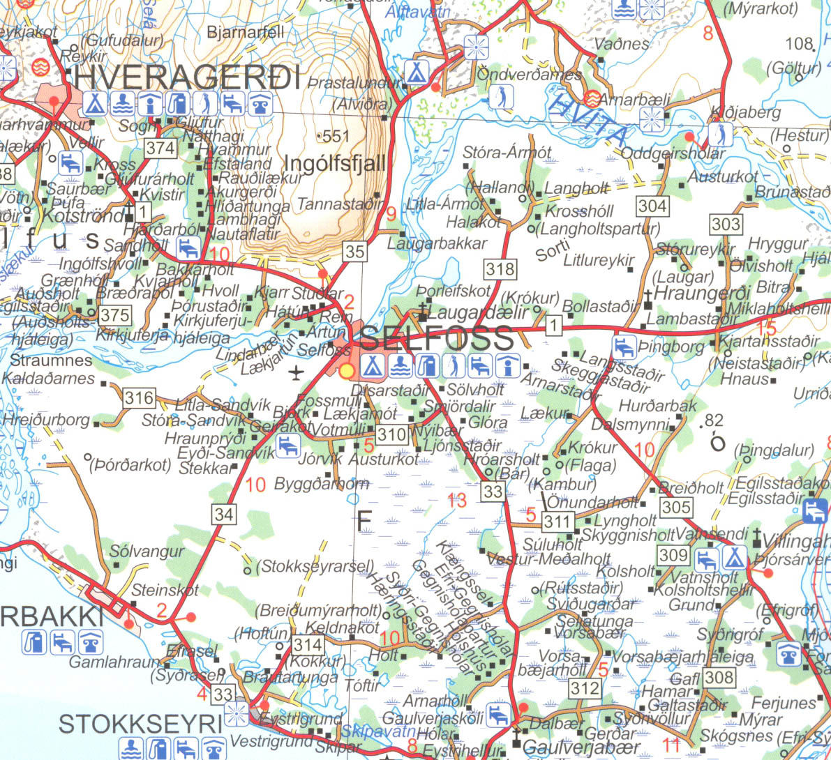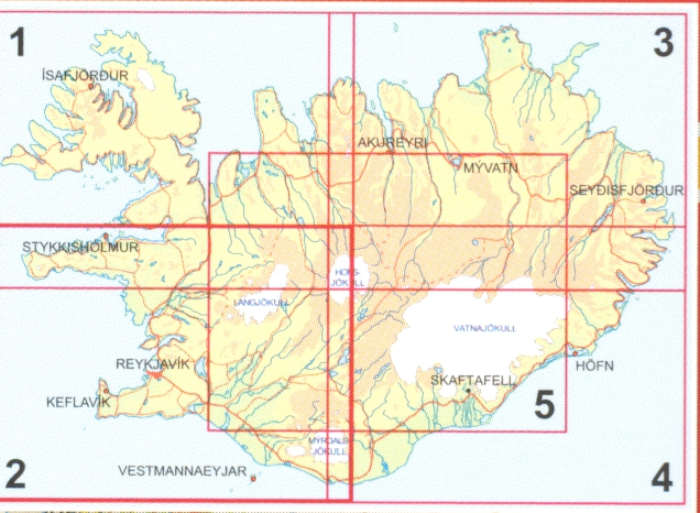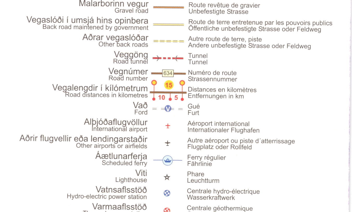Island v měřítku 1:250.000 na čtyřech podrobných silničních mapách plus pátá která poskytuje pokrytí „Vysočiny“ - nejnavštěvovanější část země, publikované na vládním podkladu. Vrstevnice jsou v intervalech 20 m, mapa má reliéfní stínování s bohatou grafikou ukazující různé typy terénu a vegetace - ledovce, lávová pole, písek, lesy a křoviny, obdělávaná půda atd. Hranice národních parků a jiných chráněných oblastí jsou značeny. Silniční sít rozlišuje štěrk a asfalt, brody přes řeky, čerpací stanice. Široká škála symbolů zobrazuje různé typy ubytování, včetně turistických chat a kempů, sportovních a rekreačních zařízení, zajímavá místa atd. Zeměpisná šířka a délka na 15'' nebo 20'' intervalech. Legenda obsahuje angličtinu.