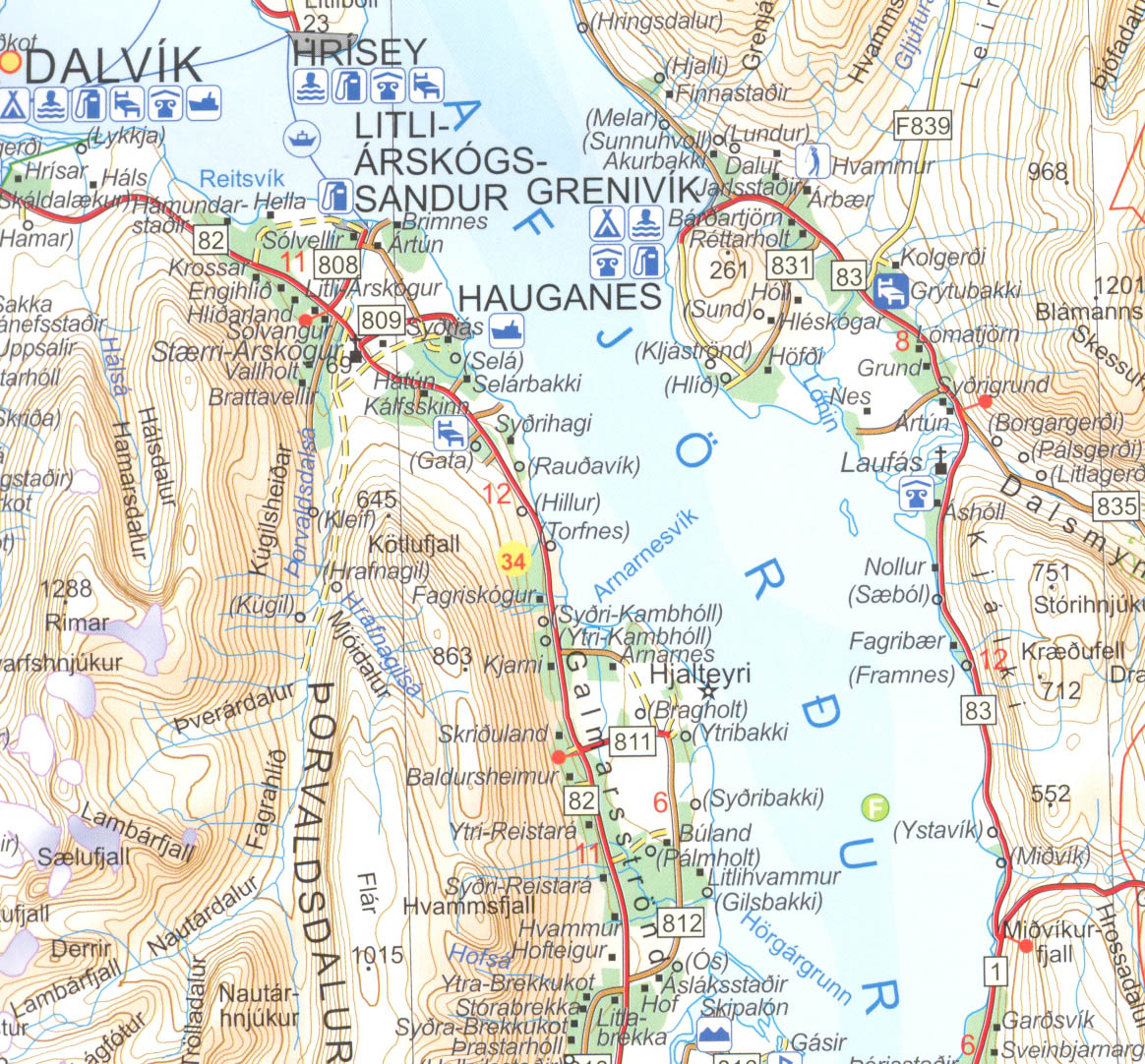 Island v měřítku 1:250.000 na čtyřech podrobných silničních mapách plus pátá která poskytuje pokrytí „Vysočiny“ - nejnavštěvovanější část země, publikované na vládním podkladu. Vrstevnice jsou v intervalech 20 m, mapa má reliéfní stínování s bohatou grafikou ukazující různé typy terénu a vegetace - ledovce, lávová pole, písek, lesy a křoviny, obdělávaná půda atd. Hranice národních parků a jiných chráněných oblastí jsou značeny. Silniční sít rozlišuje štěrk a asfalt, brody přes řeky, čerpací stanice. Široká škála symbolů zobrazuje různé typy ubytování, včetně turistických chat a kempů, sportovních a rekreačních zařízení, zajímavá místa atd. Zeměpisná šířka a délka na 15'' nebo 20'' intervalech. Legenda obsahuje angličtinu.
