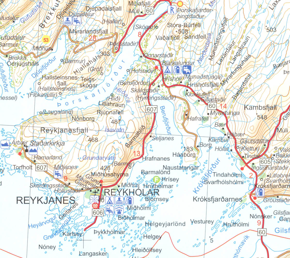 Island v měřítku 1:250.000 na čtyřech podrobných silničních mapách plus pátá která poskytuje pokrytí „Vysočiny“ - nejnavštěvovanější část země, publikované na vládním podkladu. Vrstevnice jsou v intervalech 20 m, mapa má reliéfní stínování s bohatou grafikou ukazující různé typy terénu a vegetace - ledovce, lávová pole, písek, lesy a křoviny, obdělávaná půda atd. Hranice národních parků a jiných chráněných oblastí jsou značeny. Silniční sít rozlišuje štěrk a asfalt, brody přes řeky, čerpací stanice. Široká škála symbolů zobrazuje různé typy ubytování, včetně turistických chat a kempů, sportovních a rekreačních zařízení, zajímavá místa atd. Zeměpisná šířka a délka na 15'' nebo 20'' intervalech. Legenda obsahuje angličtinu.