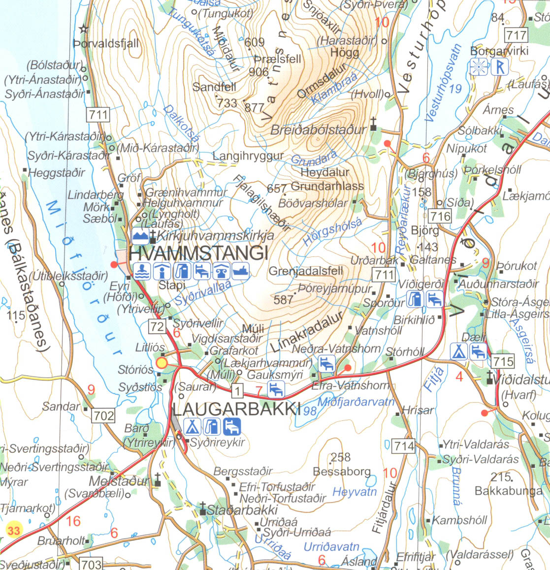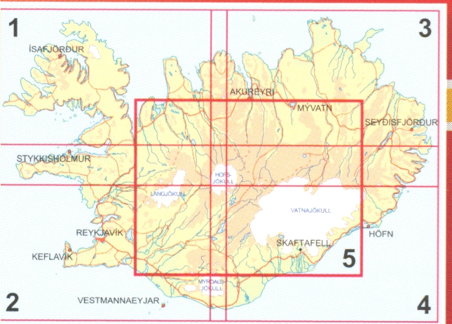 Island v měřítku 1:250.000 na čtyřech podrobných silničních mapách plus pátá která poskytuje pokrytí „Vysočiny“ - nejnavštěvovanější část země, publikované na vládním podkladu. Vrstevnice jsou v intervalech 20 m, mapa má reliéfní stínování s bohatou grafikou ukazující různé typy terénu a vegetace - ledovce, lávová pole, písek, lesy a křoviny, obdělávaná půda atd. Hranice národních parků a jiných chráněných oblastí jsou značeny. Silniční sít rozlišuje štěrk a asfalt, brody přes řeky, čerpací stanice. Široká škála symbolů zobrazuje různé typy ubytování, včetně turistických chat a kempů, sportovních a rekreačních zařízení, zajímavá místa atd. Zeměpisná šířka a délka na 15'' nebo 20'' intervalech. Legenda obsahuje angličtinu.