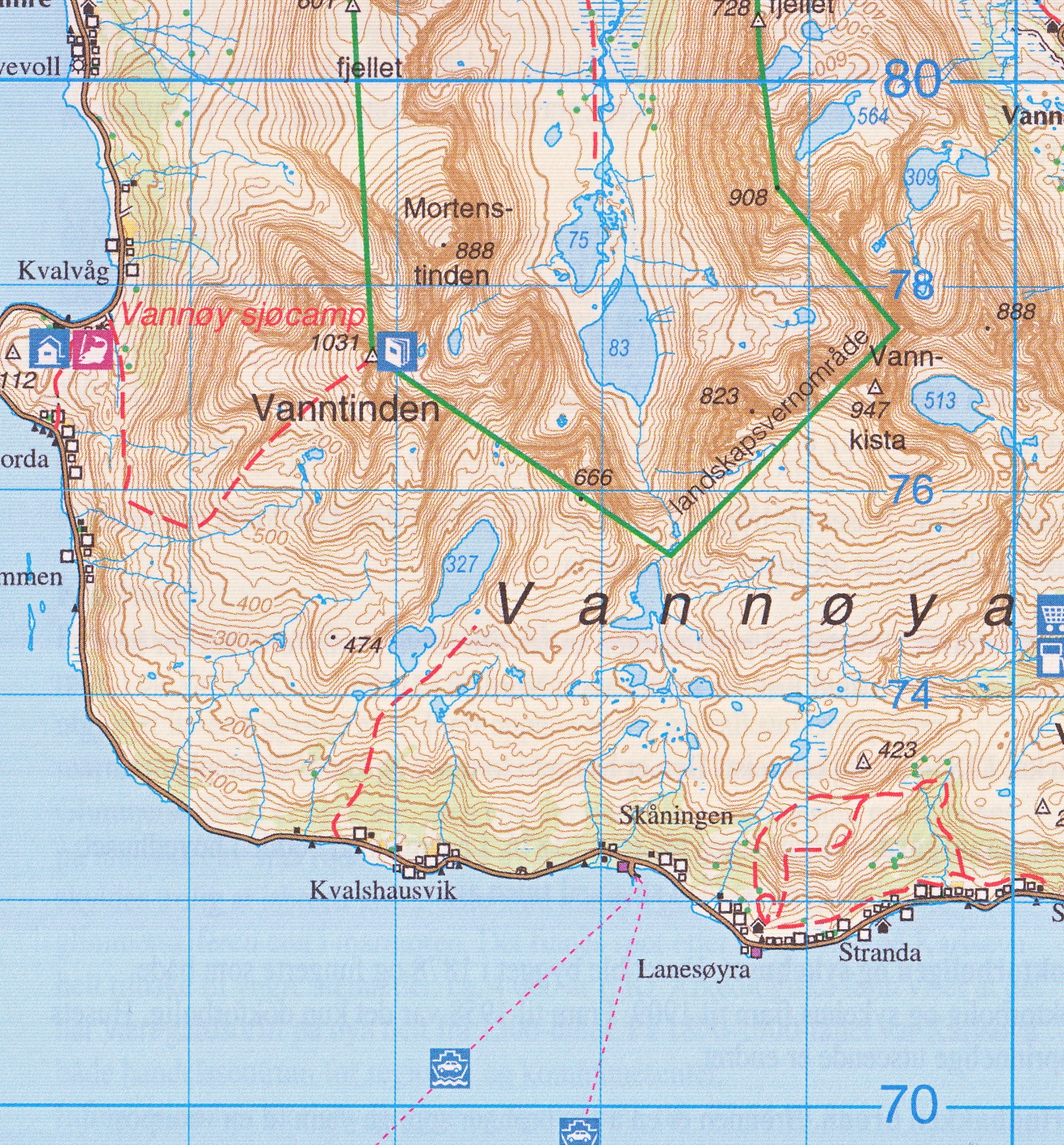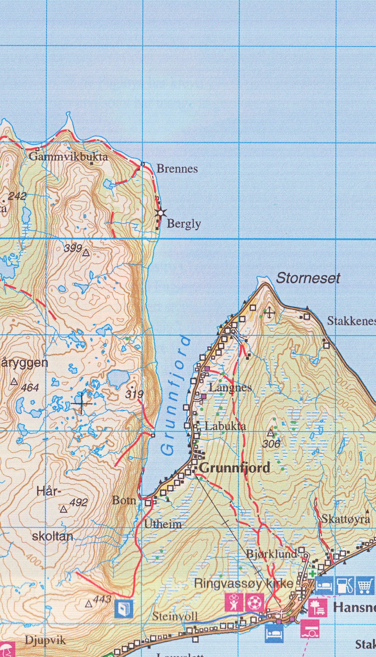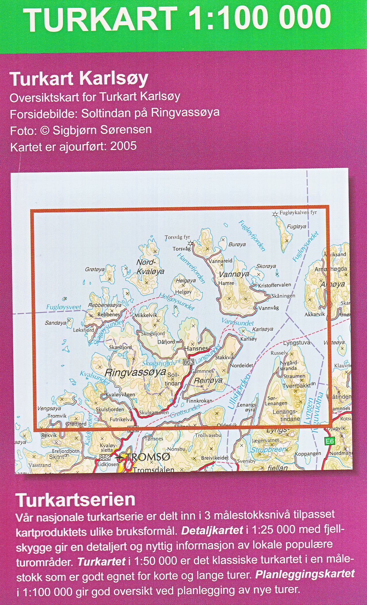 Mapa ze série GPS kompatibilních turistických map v měřítku 1:50.000/1:100.000. Vrstevnice jsou po 20m. Mapy zobrazují veškeré cesty a stezky, horské chaty a kempy, cyklistické nebo lyžařské trasy, jiné možnosti ubytování, sportovní a rekreační zařízení, sjezdovky, zajímavá místa, ledovce atd. (viz. legenda) Mapy mají UTM grid a na okrajích značenou zeměpisnou šířku a délku. Legenda mapy je norsky a anglicky. Některé tituly mají na rubové straně další turistické informace, i když ve většině případů pouze norsky. Od 1.1.2014 je doporučená maloobchodní cena těchto map na norském trhu 199,- NOK (vč. DPH 25%).