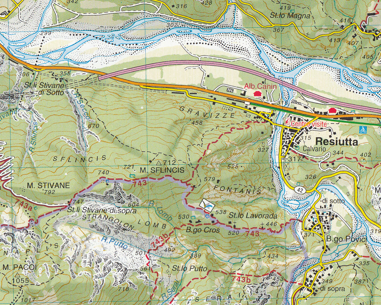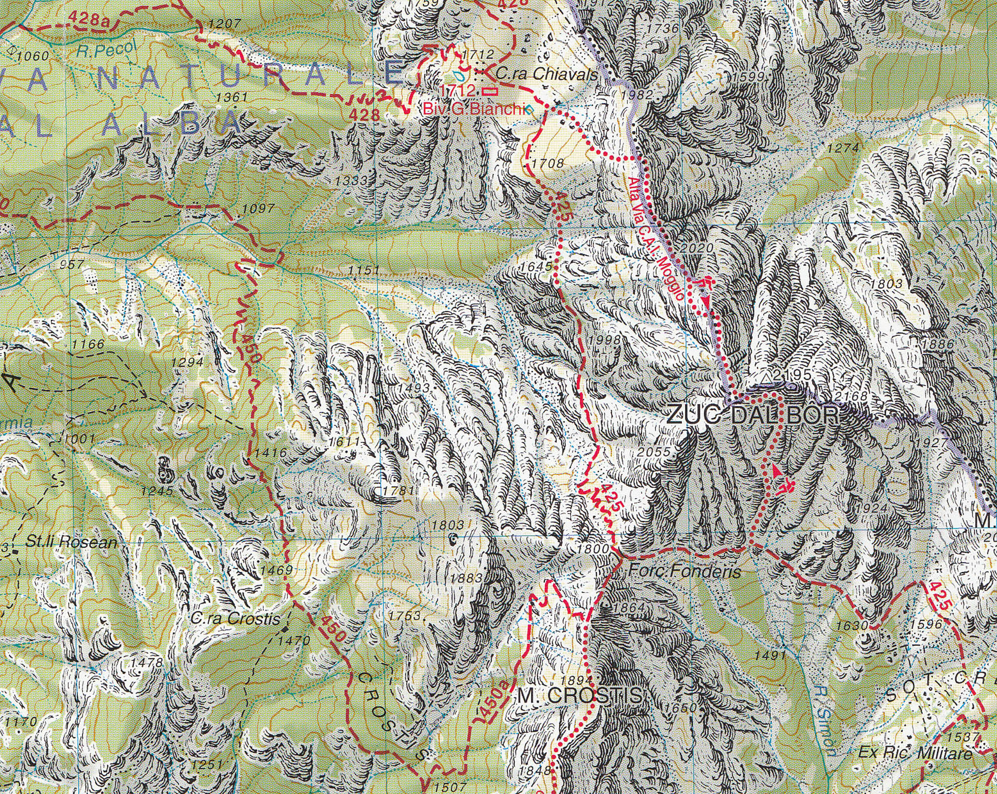 vrstevnice po 25m, stínovaný reliéf, značeny všechny druhy tras včetně "Alte Vie" a "via feratta", ubytování, lanovky, zajímavá místa atd. WGS 84