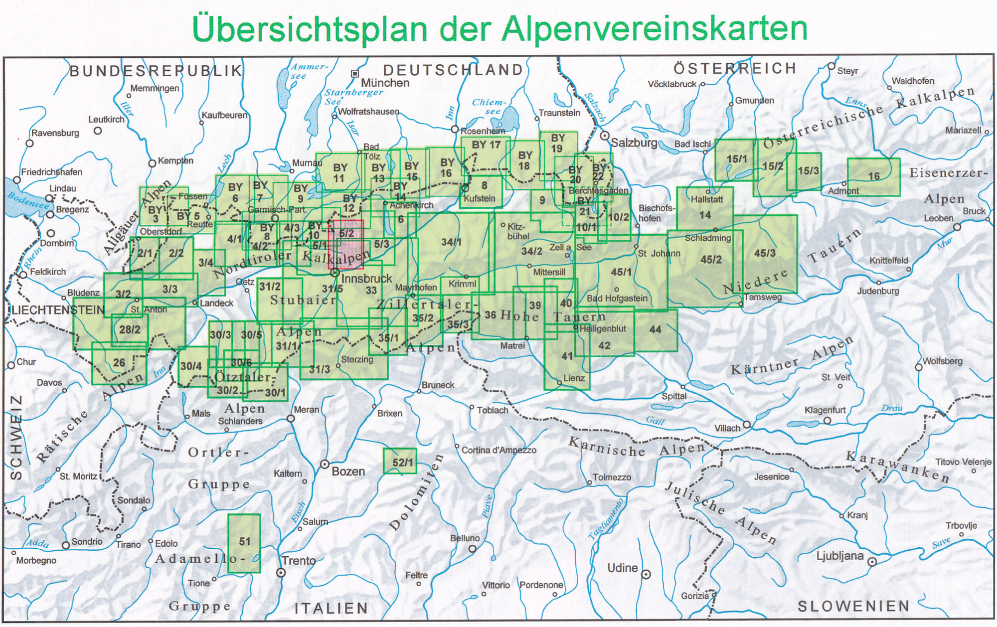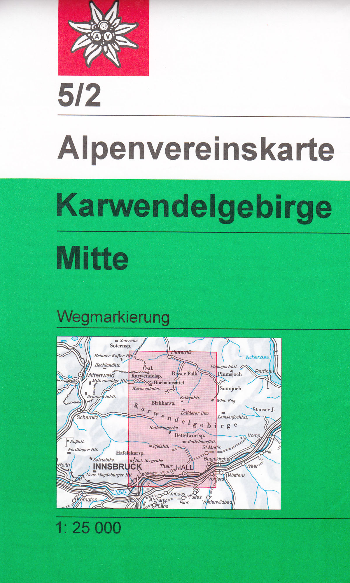 Velice podrobná mapa ze série turistických a lyžarských map vydávaných Německo-Rakouským alpským spolkem. Vrstevnice jsou zakresleny po 20 výškových metrech. Na mapě jsou vyznačeny turistické trasy s úseky fixního jištění, kempy, horské chaty a jiná ubytování. Legenda mapy je v němčině.