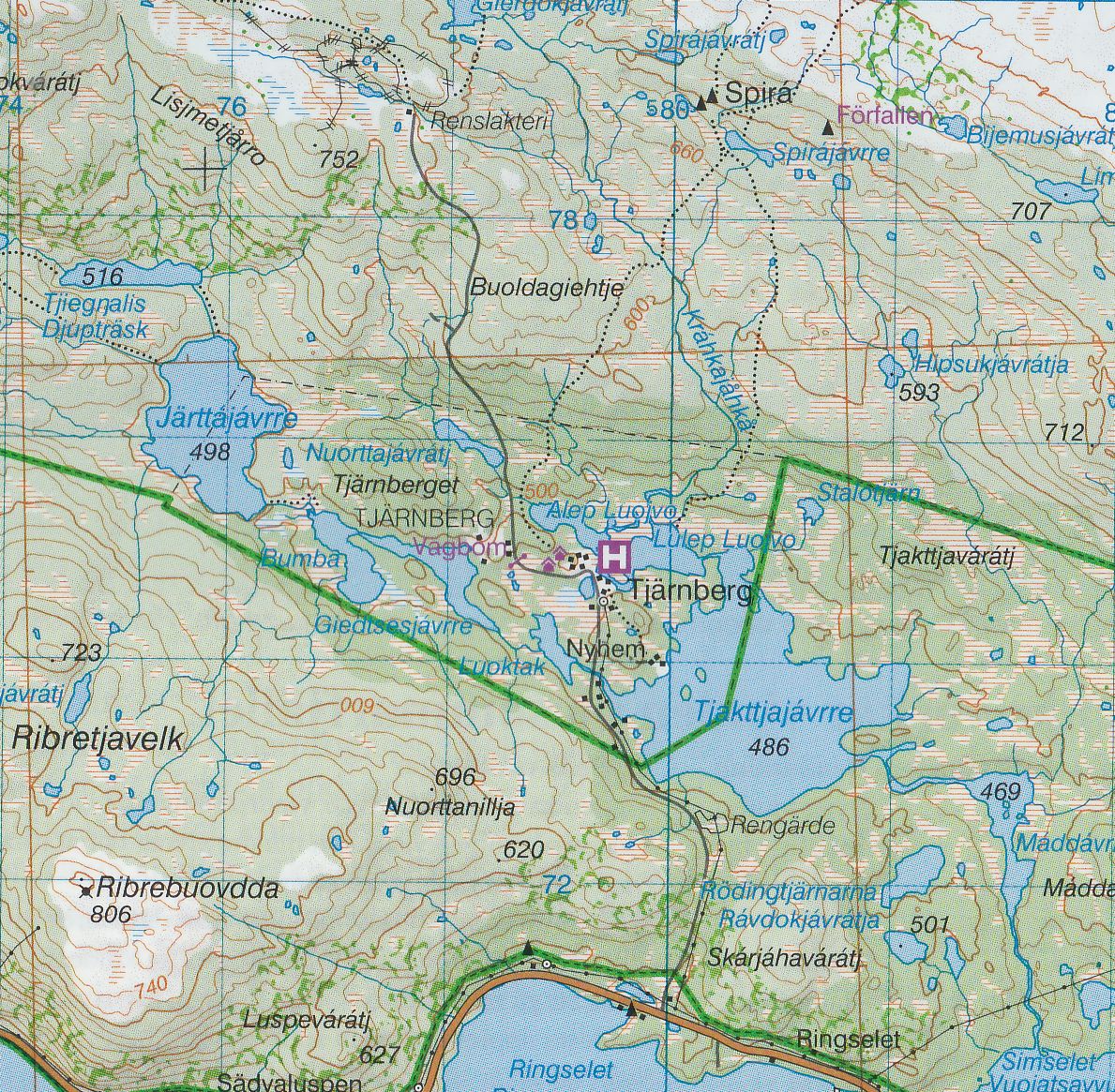 Turistická mapa ze série podrobných topografických map horských oblastí středního a severního Švédska. Vrstevnice jsou zobrazeny v intervalu 20 m a celý reliéf je opatřen stínováním. V mapě naleznete vyznačené trasy pro pěší turistiku a běžecké lyžování, trasy určené pro jízdu na sněžném skůtru, kempy, ubytovny a ostatní druhy ubytování atd. Každý list pokrývá oblast přibližně 80 x 80 km, nebo větší. Mapy obsahují UTM souřadnice a souřadnice zeměpisné šířky a délky po 10'. Legenda mapy je také v angličtině a popisy oblasti na rubu mapy pouze ve švédštině. Některé z listů navíc obsahují stručné poznámky v angličtině ohledně zón s omezeným vstupem.