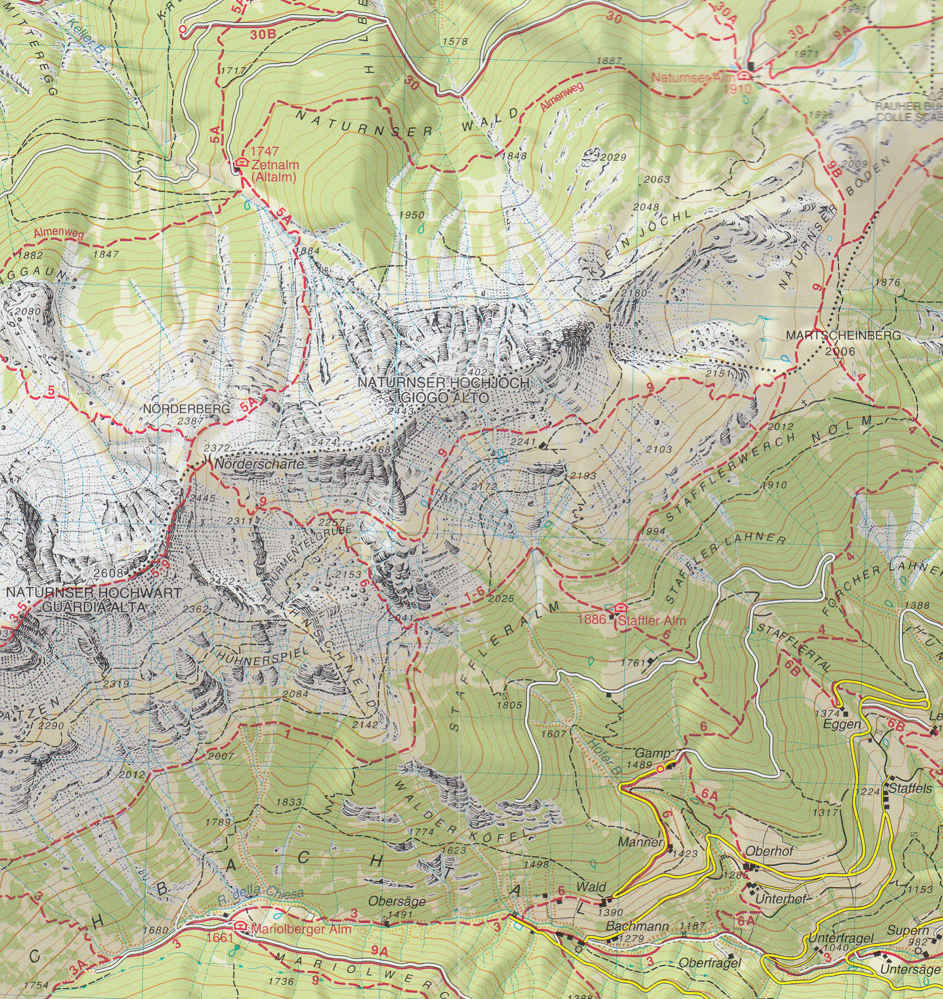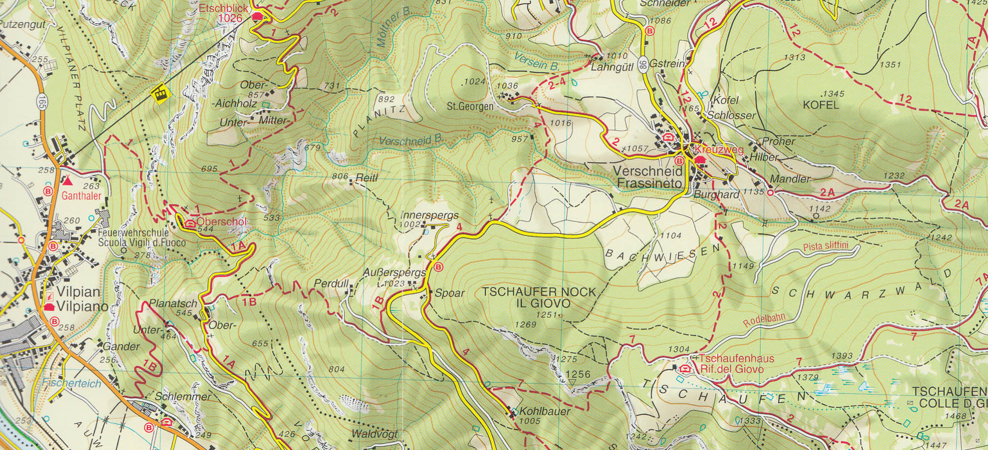 vrstevnice po 25m, stínovaný reliéf, značeny všechny druhy tras včetně "Alte Vie" a "via feratta", ubytování, lanovky, zajímavá místa atd. WGS 84