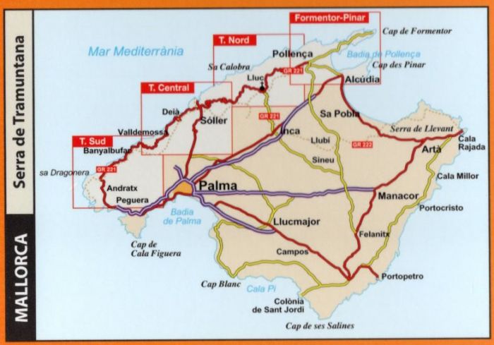This set of 4 maps covers the Tramuntana Mountains in northern Mallorca, at a scale of 1:25,000. The 4 maps show all the main walking and hiking trails in the Tramuntana Mountains, with a generous overlap between each map.