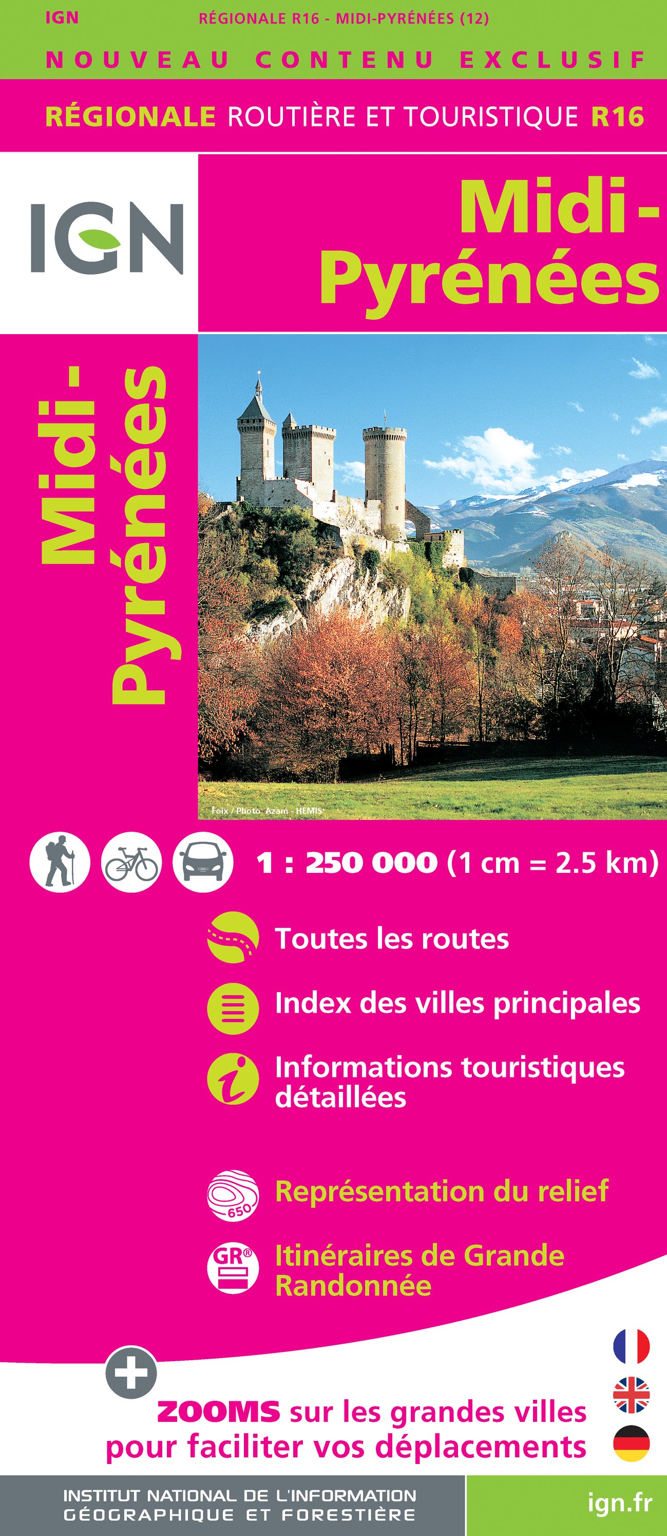 Regionální mapa Francie od národního vydavatele IGN. Vhodná pro mototuristy. Legenda je francouzsky, německy a anglicky. Jmenný rejstřík a průjezdní plány větších měst.