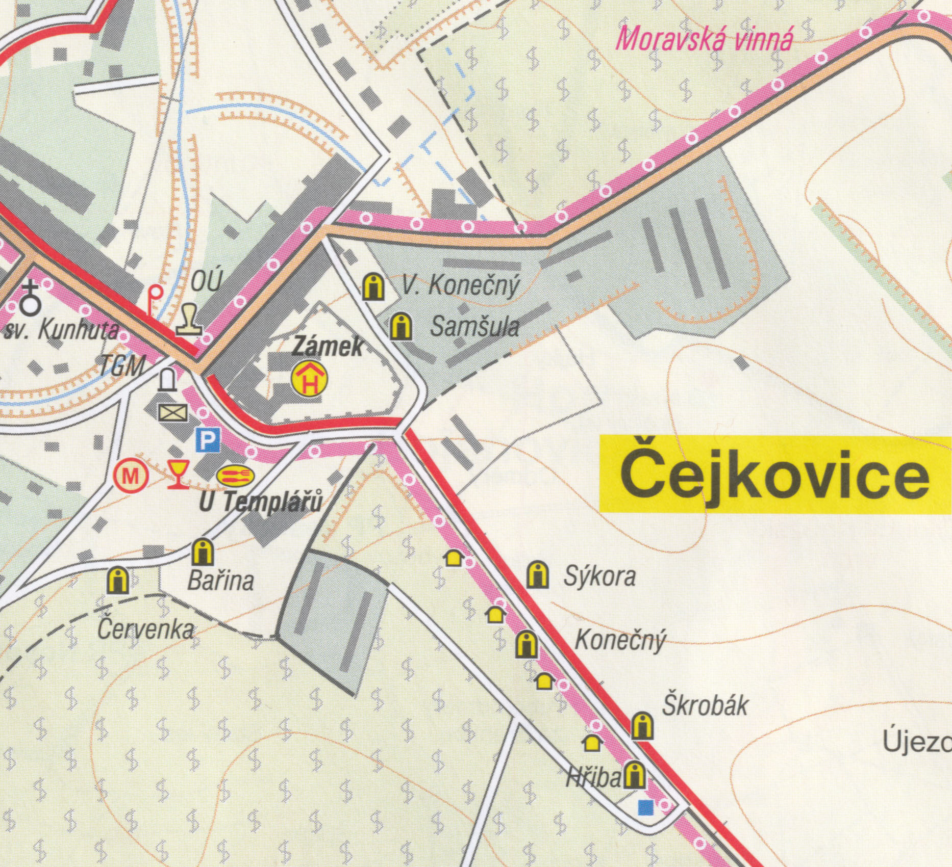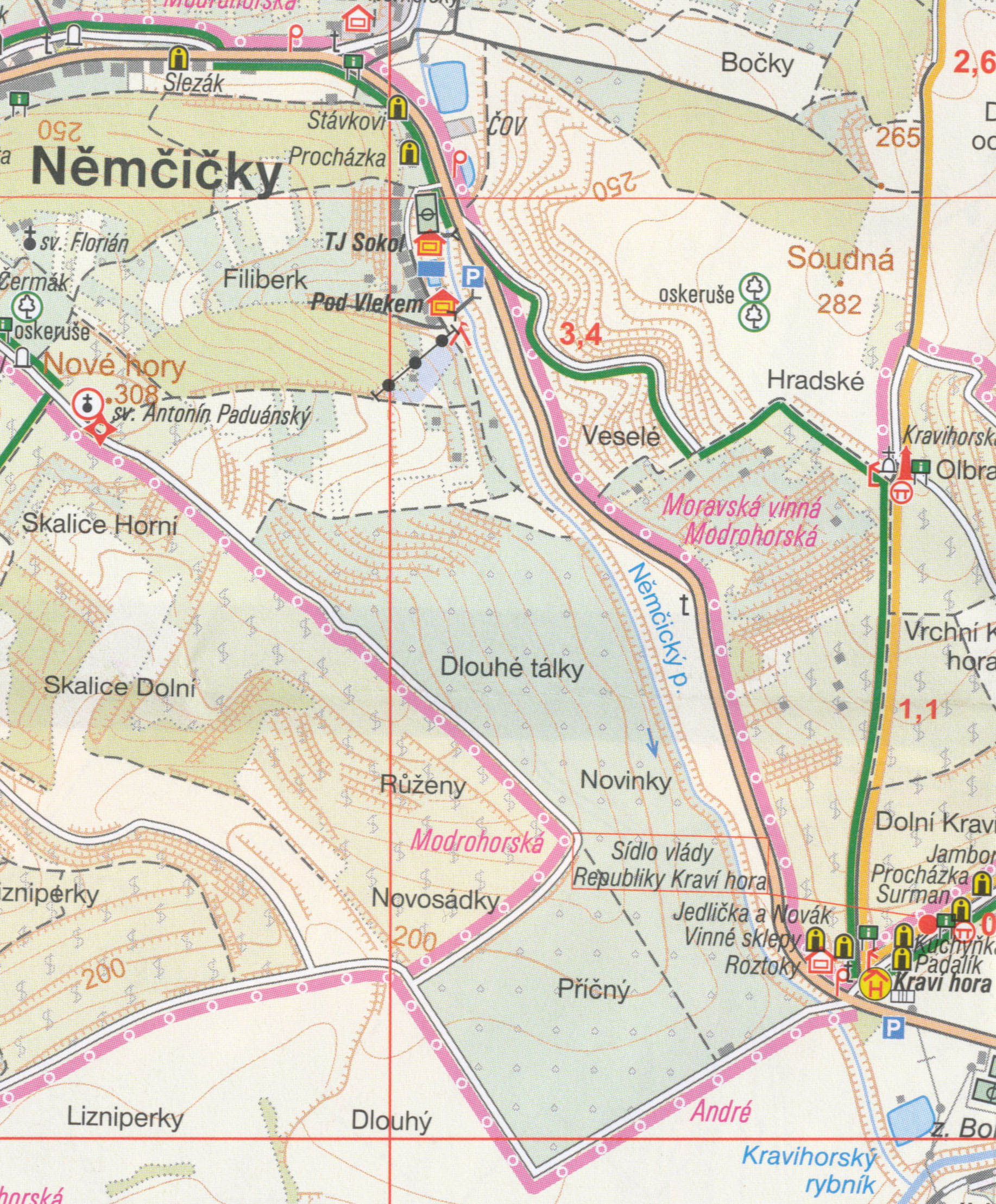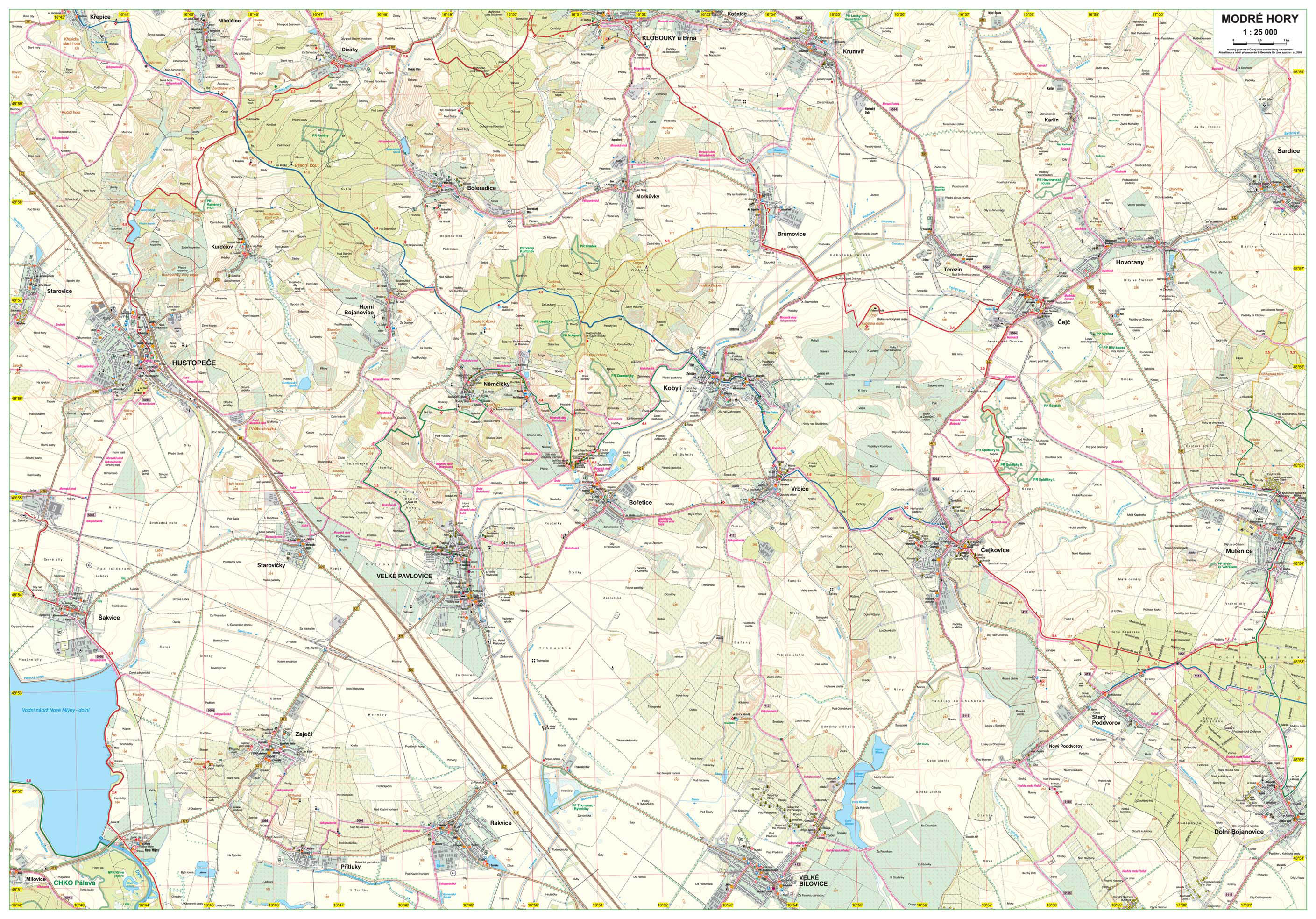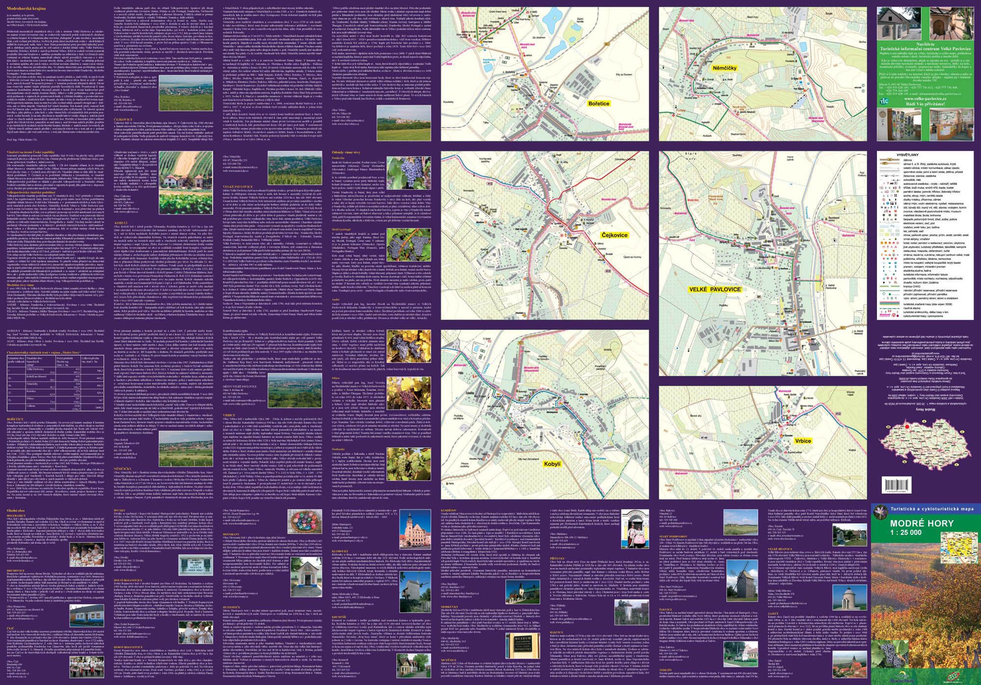 Modré Hory je vinařský mikroregion v nejjižnějším cípu Moravy (hanácké Slovácko), který tvoří pět obcí: Velké Pavlovice, Kobylí, Vrbice, Bořetice a Němčičky. Jde o oblast, kde má tradici pěstování modrých odrůd vinné révy.Toto je mimořádně podrobná mapa v měřítku 1:25 000 (1 cm = 250 m); svým měřítkem a čitelností se blíží městskému plánu. Pokrytí: mapa zobrazuje území od Klobouků u Brna na severu po Velké Bílovice na jihu a od Hustopečí na západě po Mutěnice / Dolní Bojanovice na východě, tedy podstatně větší území než samotné "Modré hory". Zadní strana obsahuje texty (pouze v češtině) o regionu Modré Hory, o místních charakteristikých odrůdách révy, fotografie a plány měst a obcí: Bořetice, Čejkovice, Kobylí, Němčičky, Velké Pavlovice, Vrbice.Mapa zobrazuje základní polohopisné a výškopisné informace jako silnice, zpevněné a nezpevněné cesty, železnice, sídla a jejich části včetně osad a samot, vodní plochy a toky, lesy, vinice, sady, zahrady, výškové kóty, vrstevnice po 10 m.Pro turisty obsahuje pásové a místní turistické značení, turistické směrovníky, kilometráž, cykloturistické trasy, naučné stezky a samozřejmě zobrazuje to nejdůležitější: vinohrady, vinařství a vinné sklípky. Dále jsou vyznačeny hrady a zámky, rozhledny a místa rozhledu, zříceniny a jiné památky, muzea a galerie, koupaliště, vybrané restaurace a ubytovací zařízení.Mapa má souřadnicovou síť WGS pro GPS, legenda je česky. Mapa je v ochranném, nepromokavém plastovém obalu.Slovácko Velké Pavlovice Kobylí Vrbice Bořetice Němčičky