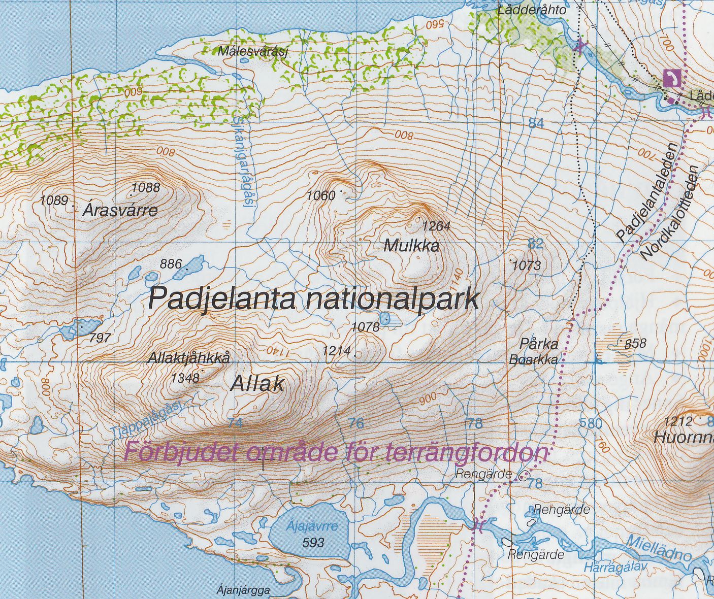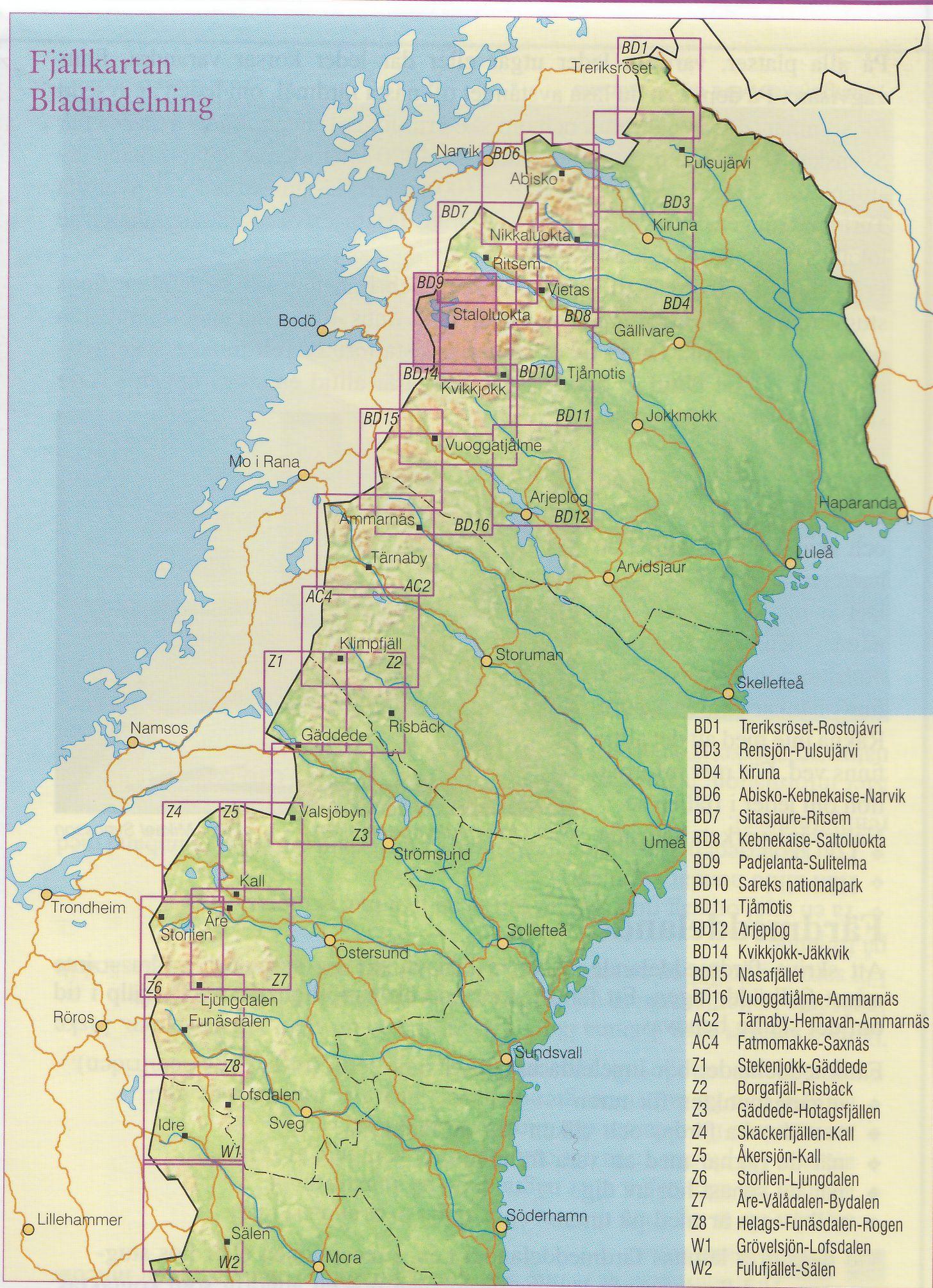 Turistická mapa ze série podrobných topografických map horských oblastí středního a severního Švédska. Vrstevnice jsou zobrazeny v intervalu 20 m a celý reliéf je opatřen stínováním. V mapě naleznete vyznačené trasy pro pěší turistiku a běžecké lyžování, trasy určené pro jízdu na sněžném skůtru, kempy, ubytovny a ostatní druhy ubytování atd. Každý list pokrývá oblast přibližně 80 x 80 km, nebo větší. Mapy obsahují UTM souřadnice a souřadnice zeměpisné šířky a délky po 10'. Legenda mapy je také v angličtině a popisy oblasti na rubu mapy pouze ve švédštině. Některé z listů navíc obsahují stručné poznámky v angličtině ohledně zón s omezeným vstupem.