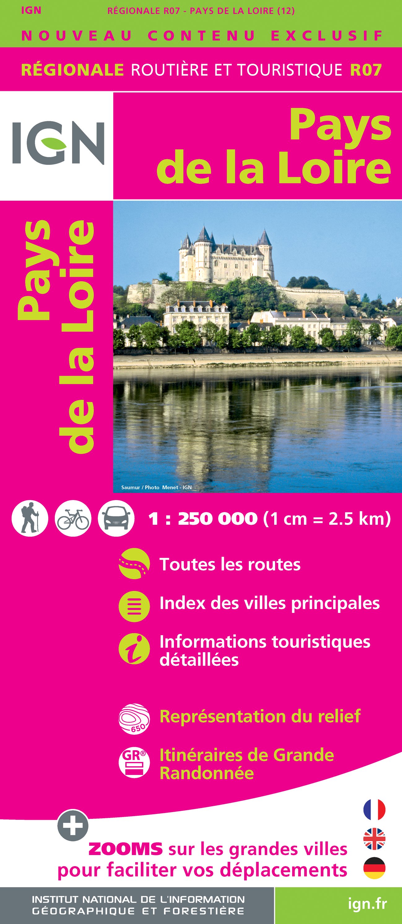 Regionální mapa Francie od národního vydavatele IGN. Vhodná pro mototuristy. Legenda je francouzsky, německy a anglicky. Jmenný rejstřík a průjezdní plány větších měst.