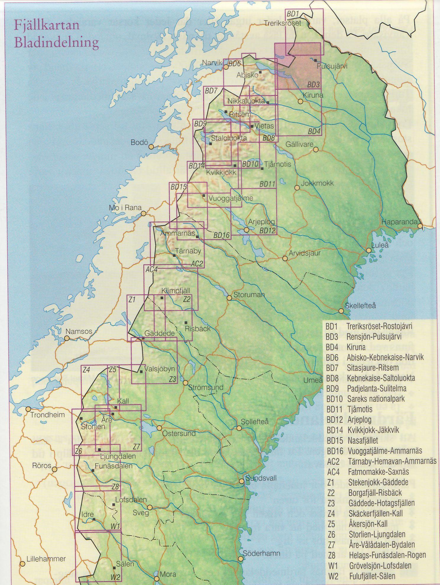 Turistická mapa ze série podrobných topografických map horských oblastí středního a severního Švédska. Vrstevnice jsou zobrazeny v intervalu 20 m a celý reliéf je opatřen stínováním. V mapě naleznete vyznačené trasy pro pěší turistiku a běžecké lyžování, trasy určené pro jízdu na sněžném skůtru, kempy, ubytovny a ostatní druhy ubytování atd. Každý list pokrývá oblast přibližně 80 x 80 km, nebo větší. Mapy obsahují UTM souřadnice a souřadnice zeměpisné šířky a délky po 10'. Legenda mapy je také v angličtině a popisy oblasti na rubu mapy pouze ve švédštině. Některé z listů navíc obsahují stručné poznámky v angličtině ohledně zón s omezeným vstupem.