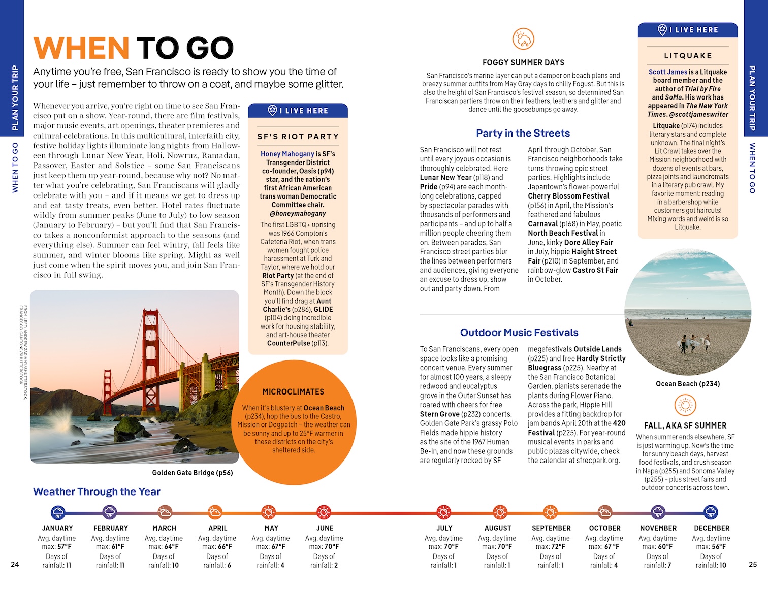 Covers: The Presidio, Marina & Fisherman's Wharf; Downtown, Civic Center & SoMa; Chinatown & North Beach; Nob Hill & Russian Hill; Japantown, Fillmore & Pacific Heights; The Mission, Dogpatch & Potrero; The Castro; The Haight & Hayes Valley; Golden Gate Park & the Avenues plus day trips to Alcatraz; Angel Island; Treasure Island; Oakland; Berkely; Muir Woods; Napa