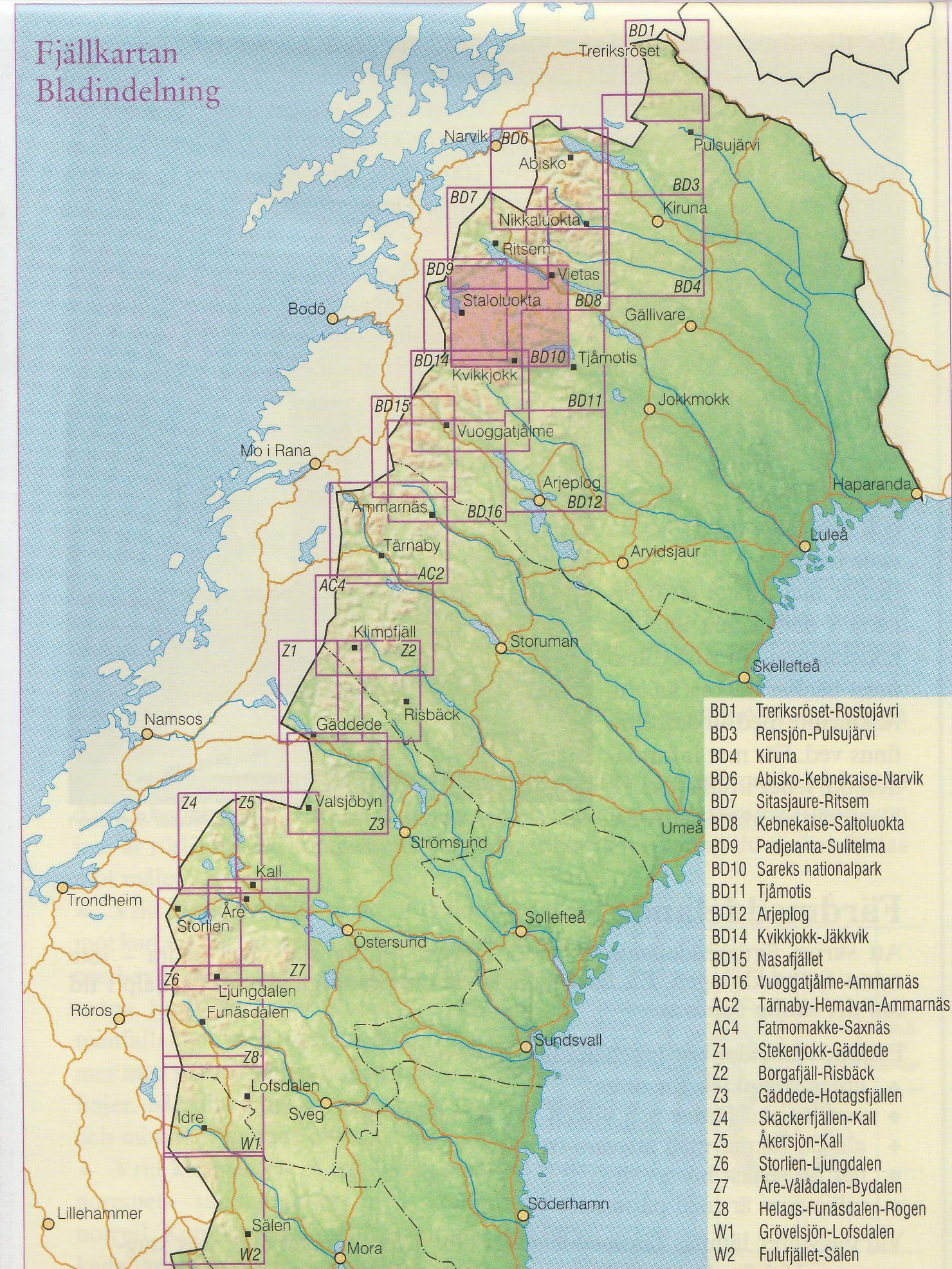 Turistická mapa ze série podrobných topografických map horských oblastí středního a severního Švédska. Vrstevnice jsou zobrazeny v intervalu 20 m a celý reliéf je opatřen stínováním. V mapě naleznete vyznačené trasy pro pěší turistiku a běžecké lyžování, trasy určené pro jízdu na sněžném skůtru, kempy, ubytovny a ostatní druhy ubytování atd. Každý list pokrývá oblast přibližně 80 x 80 km, nebo větší. Mapy obsahují UTM souřadnice a souřadnice zeměpisné šířky a délky po 10'. Legenda mapy je také v angličtině a popisy oblasti na rubu mapy pouze ve švédštině. Některé z listů navíc obsahují stručné poznámky v angličtině ohledně zón s omezeným vstupem.