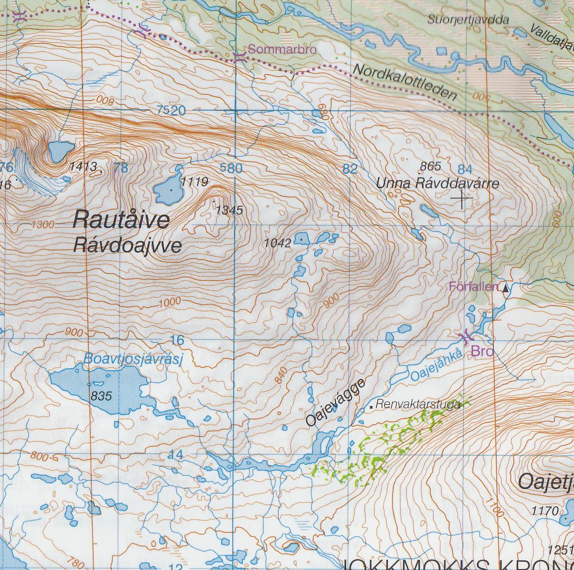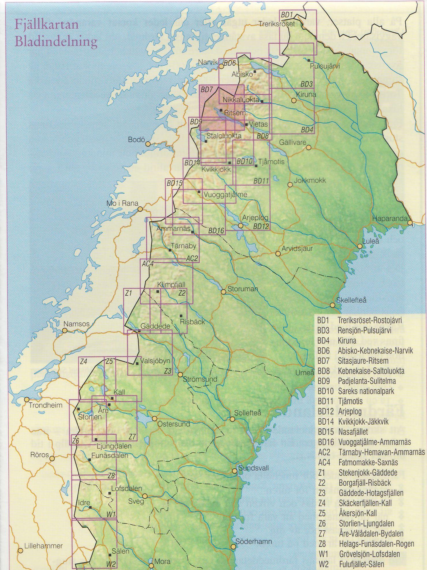 Turistická mapa ze série podrobných topografických map horských oblastí středního a severního Švédska. Vrstevnice jsou zobrazeny v intervalu 20 m a celý reliéf je opatřen stínováním. V mapě naleznete vyznačené trasy pro pěší turistiku a běžecké lyžování, trasy určené pro jízdu na sněžném skůtru, kempy, ubytovny a ostatní druhy ubytování atd. Každý list pokrývá oblast přibližně 80 x 80 km, nebo větší. Mapy obsahují UTM souřadnice a souřadnice zeměpisné šířky a délky po 10'. Legenda mapy je také v angličtině a popisy oblasti na rubu mapy pouze ve švédštině. Některé z listů navíc obsahují stručné poznámky v angličtině ohledně zón s omezeným vstupem.