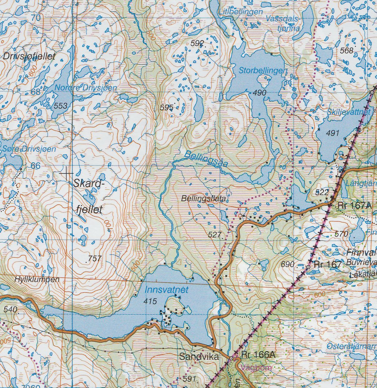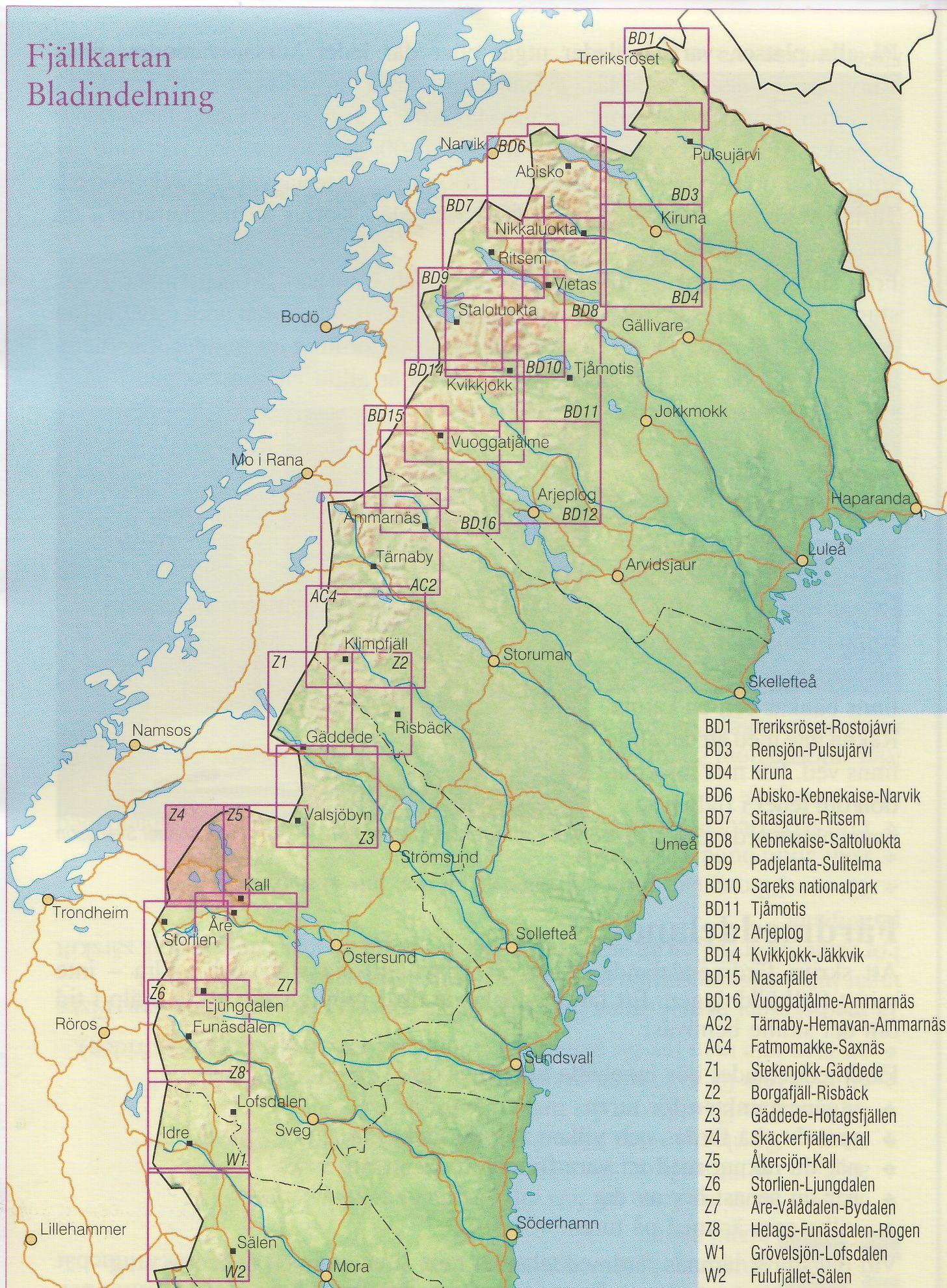 Turistická mapa ze série podrobných topografických map horských oblastí středního a severního Švédska. Vrstevnice jsou zobrazeny v intervalu 20 m a celý reliéf je opatřen stínováním. V mapě naleznete vyznačené trasy pro pěší turistiku a běžecké lyžování, trasy určené pro jízdu na sněžném skůtru, kempy, ubytovny a ostatní druhy ubytování atd. Každý list pokrývá oblast přibližně 80 x 80 km, nebo větší. Mapy obsahují UTM souřadnice a souřadnice zeměpisné šířky a délky po 10'. Legenda mapy je také v angličtině a popisy oblasti na rubu mapy pouze ve švédštině. Některé z listů navíc obsahují stručné poznámky v angličtině ohledně zón s omezeným vstupem.