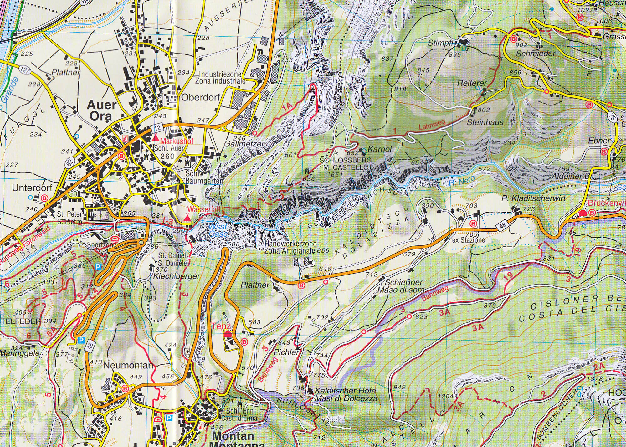 vrstevnice po 25m, stínovaný reliéf, značeny všechny druhy tras včetně "Alte Vie" a "via feratta", ubytování, lanovky, zajímavá místa atd. WGS 84