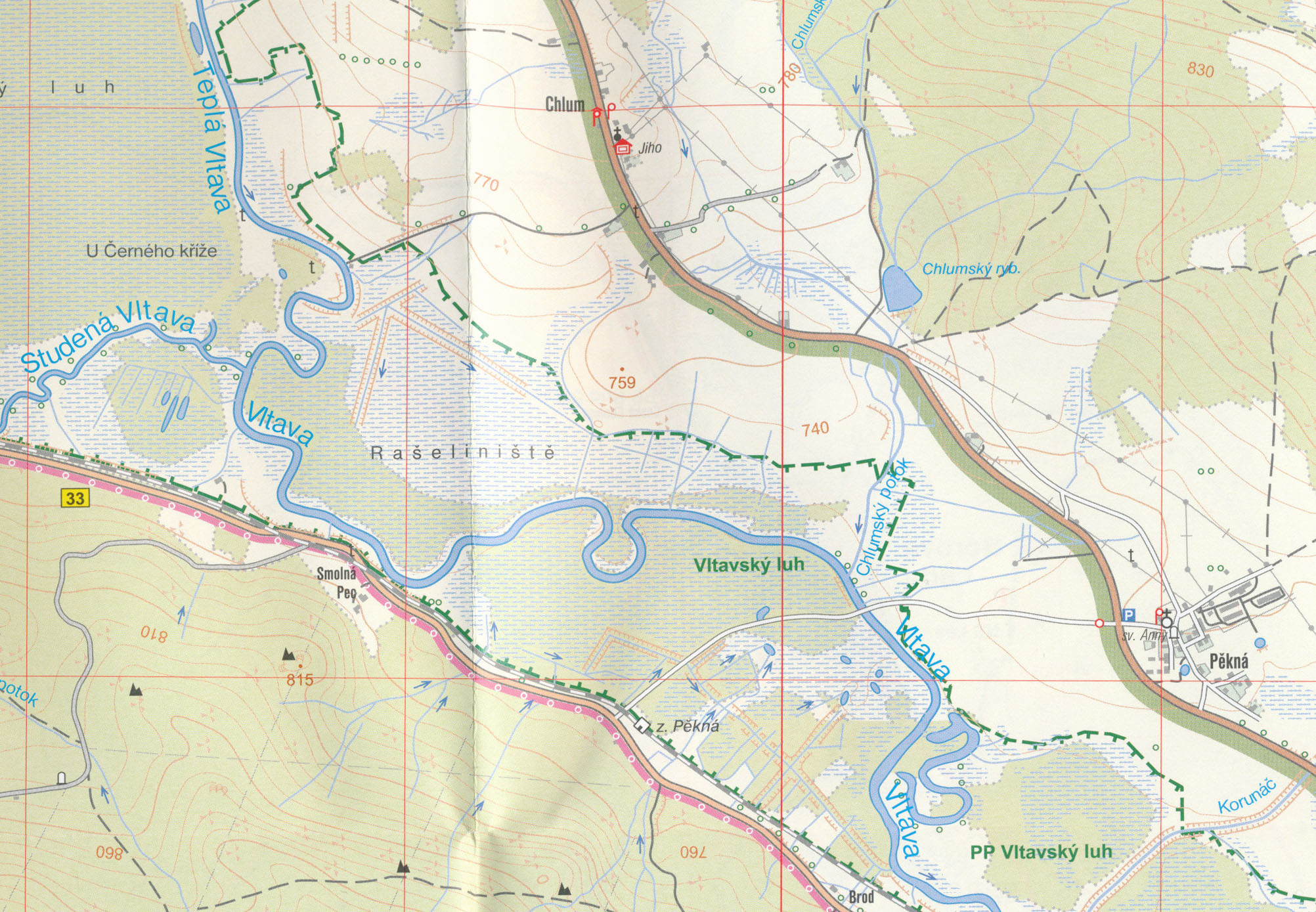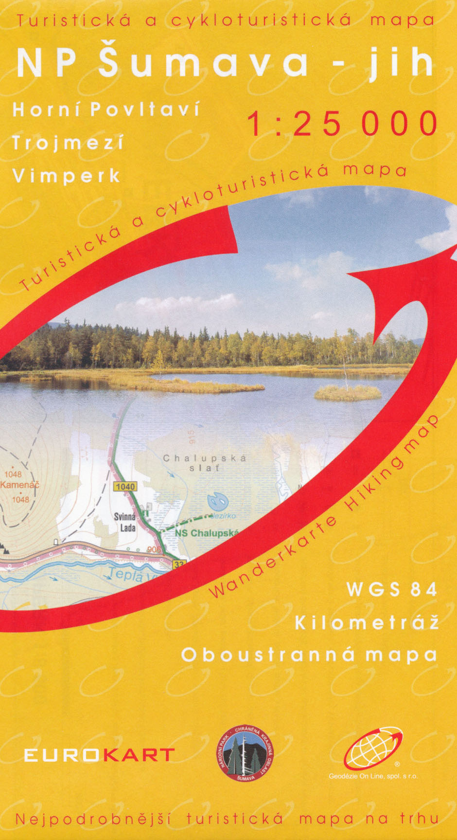 Oboustranná, mimořádně podrobná mapa v měřítku 1:25 000 (1 cm = 250 m) se svým měřítkem a čitelností blíží městskému plánu. Pokrytí: pokrytí od Borové Lady po Novou Pec, včetně Horní Vltavice, Strážného a Volar. Mapa jen mírně přesahuje na území Rakouska. Přidán je plán ulic Vimperka.Mapa zobrazuje základní polohopisné a výškopisné informace jako silnice, zpevněné a nezpevněné cesty, železnice, sídla a jejich části včetně osad a samot, vodní plochy a toky, ostatní plochy (např. lesy, skály), hranice NP a dalších chráněných území, výškové kóty, vrstevnice po 10 m.Pro turisty obsahuje pásové a místní turistické značení, turistické směrovníky, kilometráž; cykloturistické trasy; naučné stezky, trasy pro invalidní vozíky a samozřejmě zobrazuje turisticky atraktivní místa - hrady a zámky, rozhledny a místa rozhledu, zříceniny a jiné památky, hustou síť hraničního opevnění, muzea a galerie, koupaliště, vybrané restaurace a ubytovací zařízení.Mapa má souřadnicovou síť WGS pro GPS, legenda je česky a anglicky. Mapa je v ochranném, nepromokavém plastovém obalu.Šumava Povltaví Trojmezí Vimperk Lipno