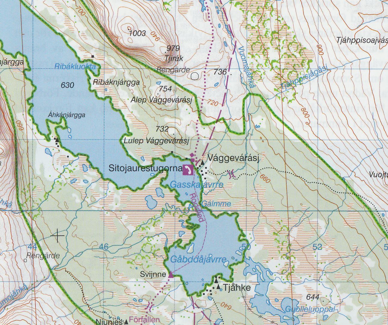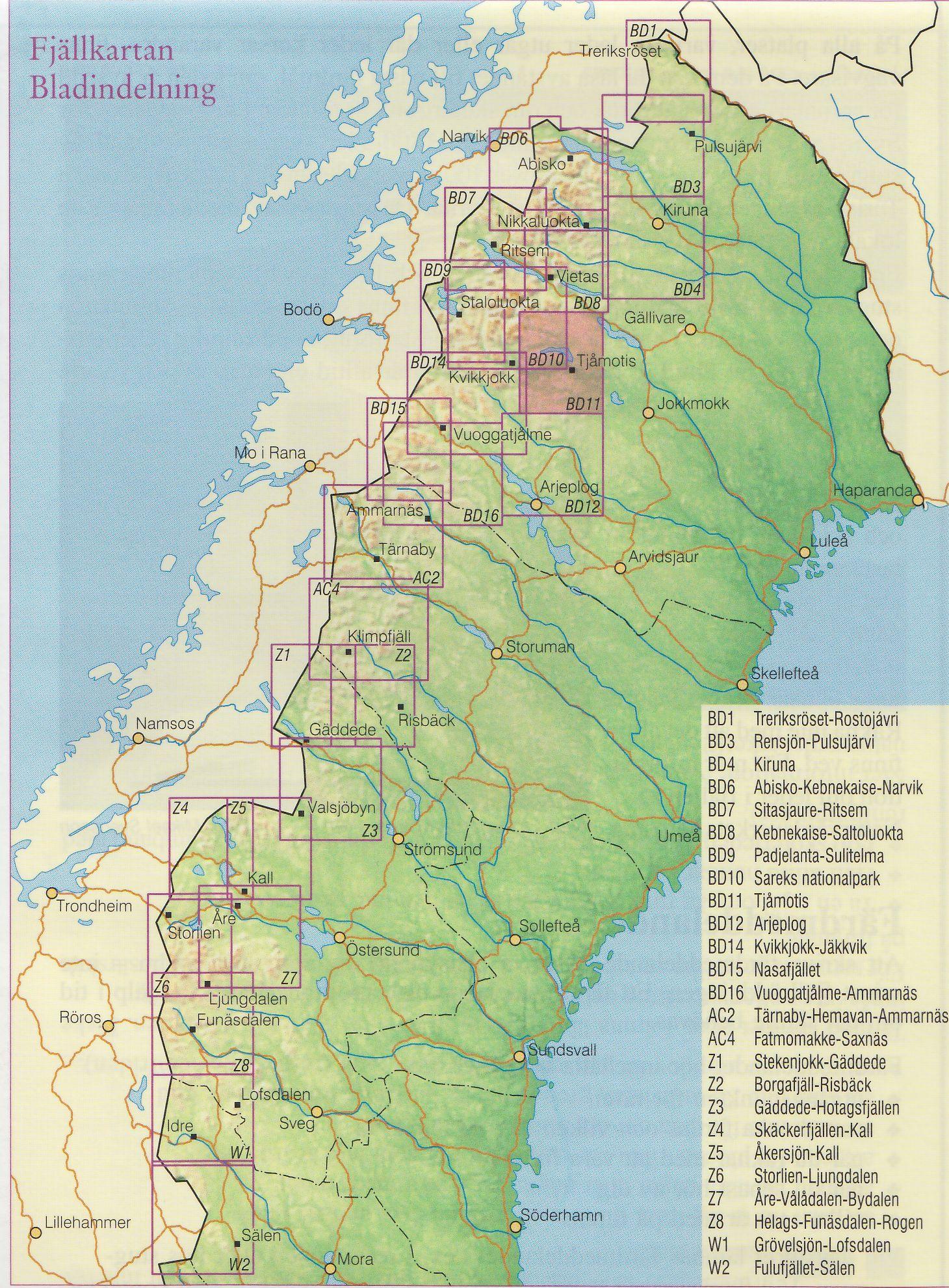Turistická mapa ze série podrobných topografických map horských oblastí středního a severního Švédska. Vrstevnice jsou zobrazeny v intervalu 20 m a celý reliéf je opatřen stínováním. V mapě naleznete vyznačené trasy pro pěší turistiku a běžecké lyžování, trasy určené pro jízdu na sněžném skůtru, kempy, ubytovny a ostatní druhy ubytování atd. Každý list pokrývá oblast přibližně 80 x 80 km, nebo větší. Mapy obsahují UTM souřadnice a souřadnice zeměpisné šířky a délky po 10'. Legenda mapy je také v angličtině a popisy oblasti na rubu mapy pouze ve švédštině. Některé z listů navíc obsahují stručné poznámky v angličtině ohledně zón s omezeným vstupem.