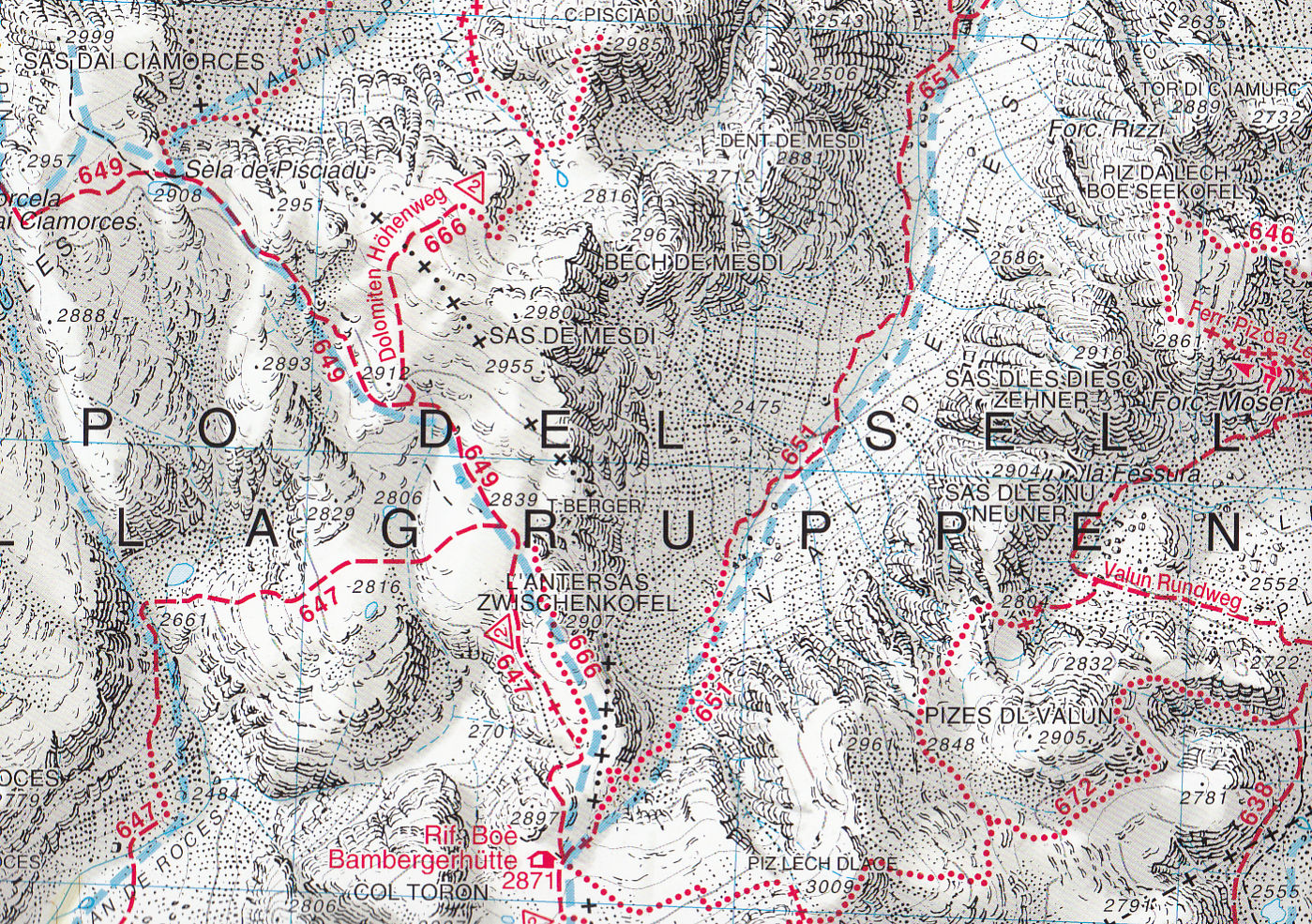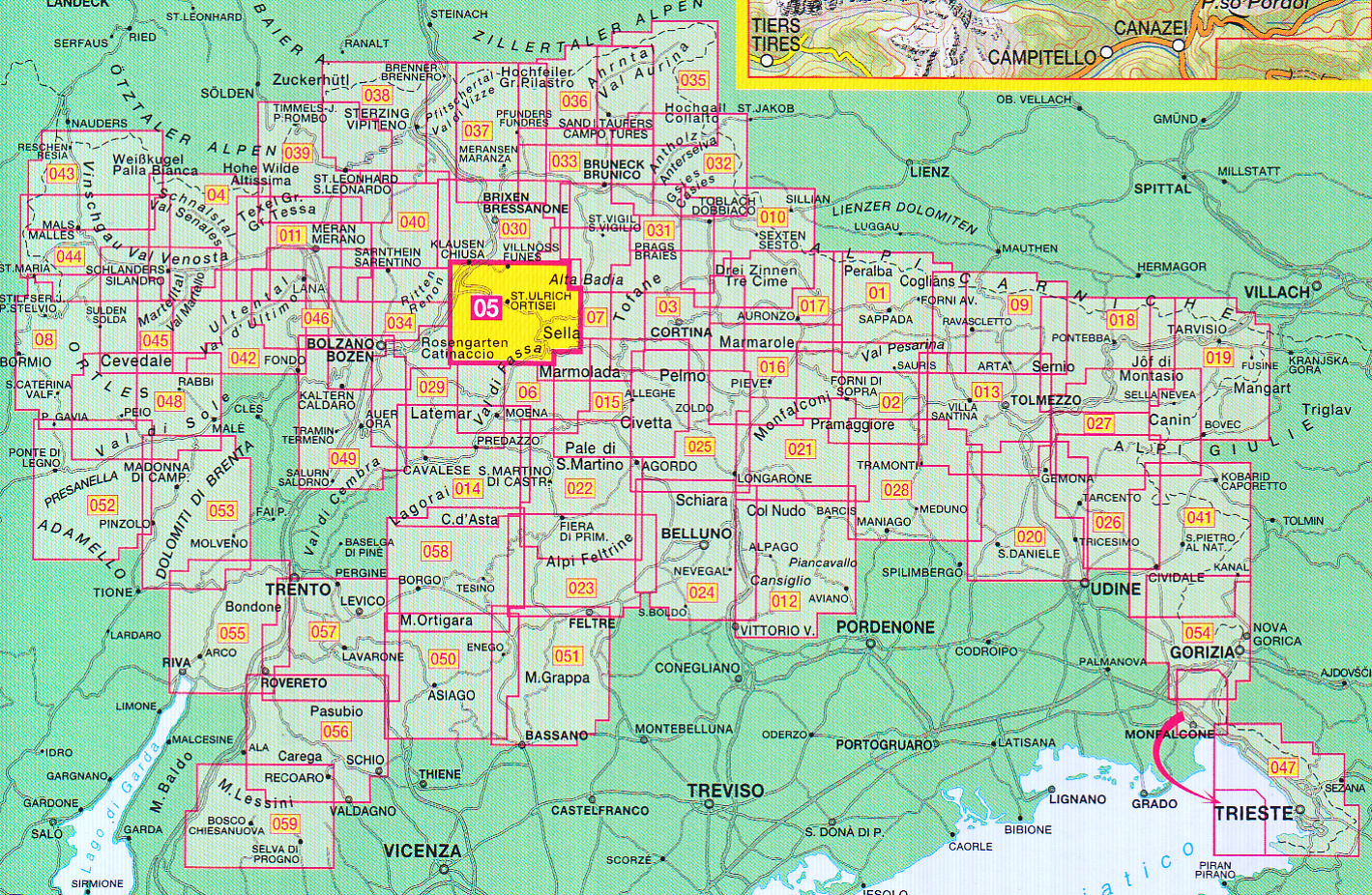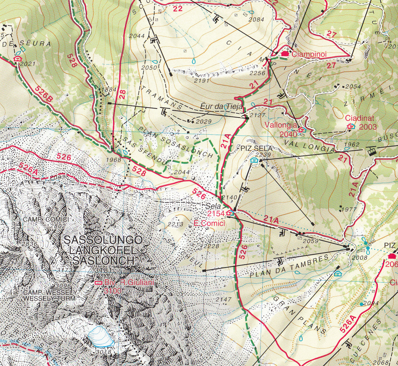 Vydání 2022. Vrstevnice po 25m, stínovaný reliéf, značeny všechny druhy tras včetně "Alte Vie" a "via feratta", ubytování, lanovky, zajímavá místa atd. WGS 84