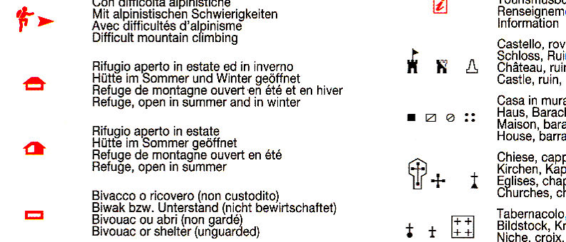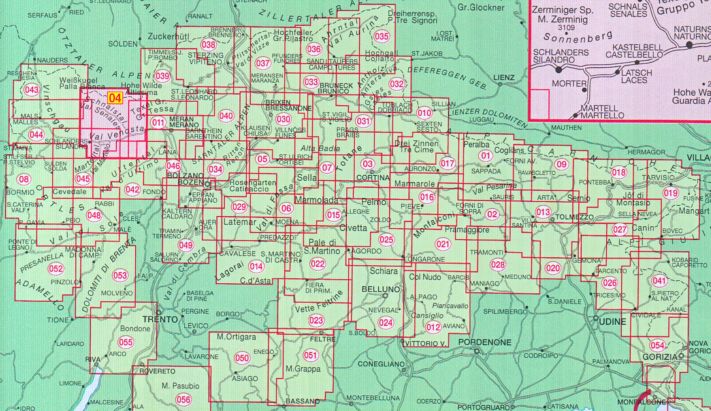 vrstevnice po 25m, stínovaný reliéf, značeny všechny druhy tras včetně "Alte Vie" a "via feratta", ubytování, lanovky, zajímavá místa atd. WGS 84